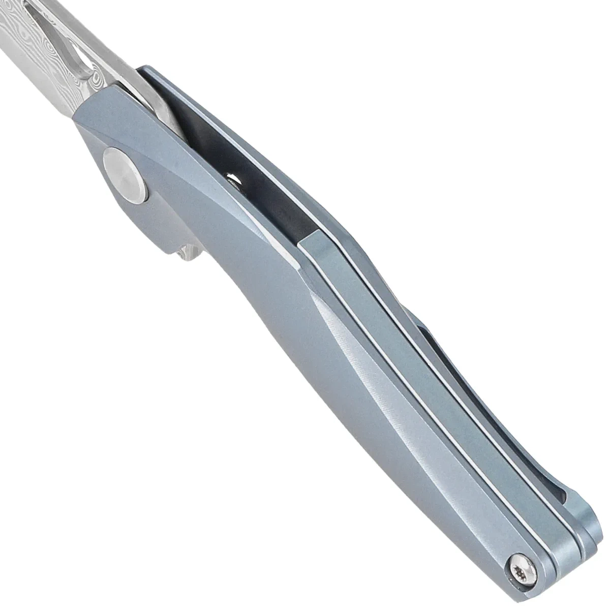 • Reticulan Blue Titanium, Damascus, a premium EDC knife design by Elijah Isham. Aggressive Sheepfoot blade made of damascus with a unique design. Flipper quick flipper opening, titanium grips, ceramic bearings, sheath for hanging around the neck.
