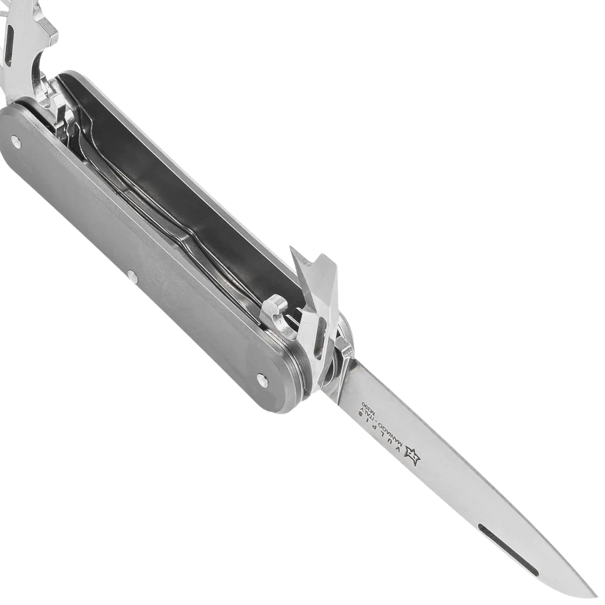 • Vulpis SF5 Sandblasted Titanium, Polished, if you're bored with Swiss design, try Italian elegance! The new Fox Knives Vulpis series wants you to not give up good steel in a new small and versatile multi-tool!