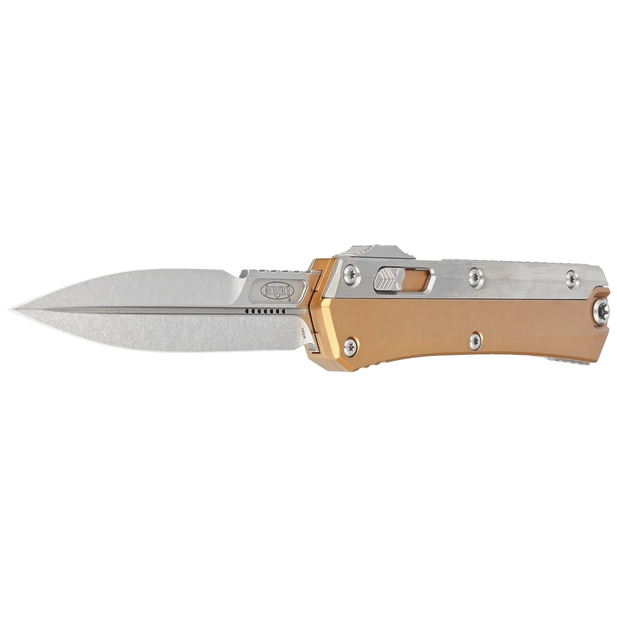 Glykon Bayonet Tan Aluminum/Titanium, Stonewashed is a large OTF (Out The Front) automatic knife from the Glykon series. The first OTF automatic with a three-way button for full ambidextrous operation, it features a helluva fast mechanism that extends a razor-sharp blade. 100% made and assembled in the USA. Designed by Anthony and Sean Marfione of Microtech Knives.