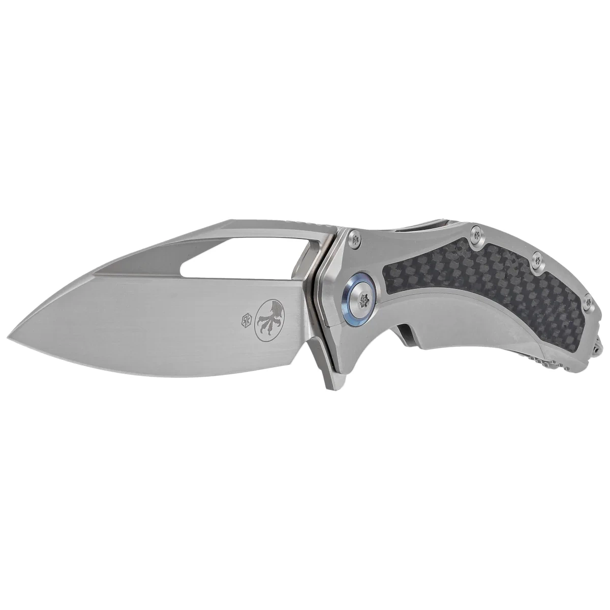 Handle - made with perfect precision in 3D technology on CNC milling machines from titanium. Perfectly fitted inlays (inlay) of Carbon Fiber composite make the knife does not slip in the hand during use. There are notches (jimping) on the back of the Handle for a more secure grip. Ergonomic profile and titanium milled single-position pocket clip for carrying the knife in tip-up(blade tip up) position. Equipped with a smooth rollerball, which allows the knife to slide easily into a pocket without damaging the edges. Mounted on the Handle with a massive glass breaker made of tungsten. The pivot axis decorated with a blue rim (pivot collar cap).
