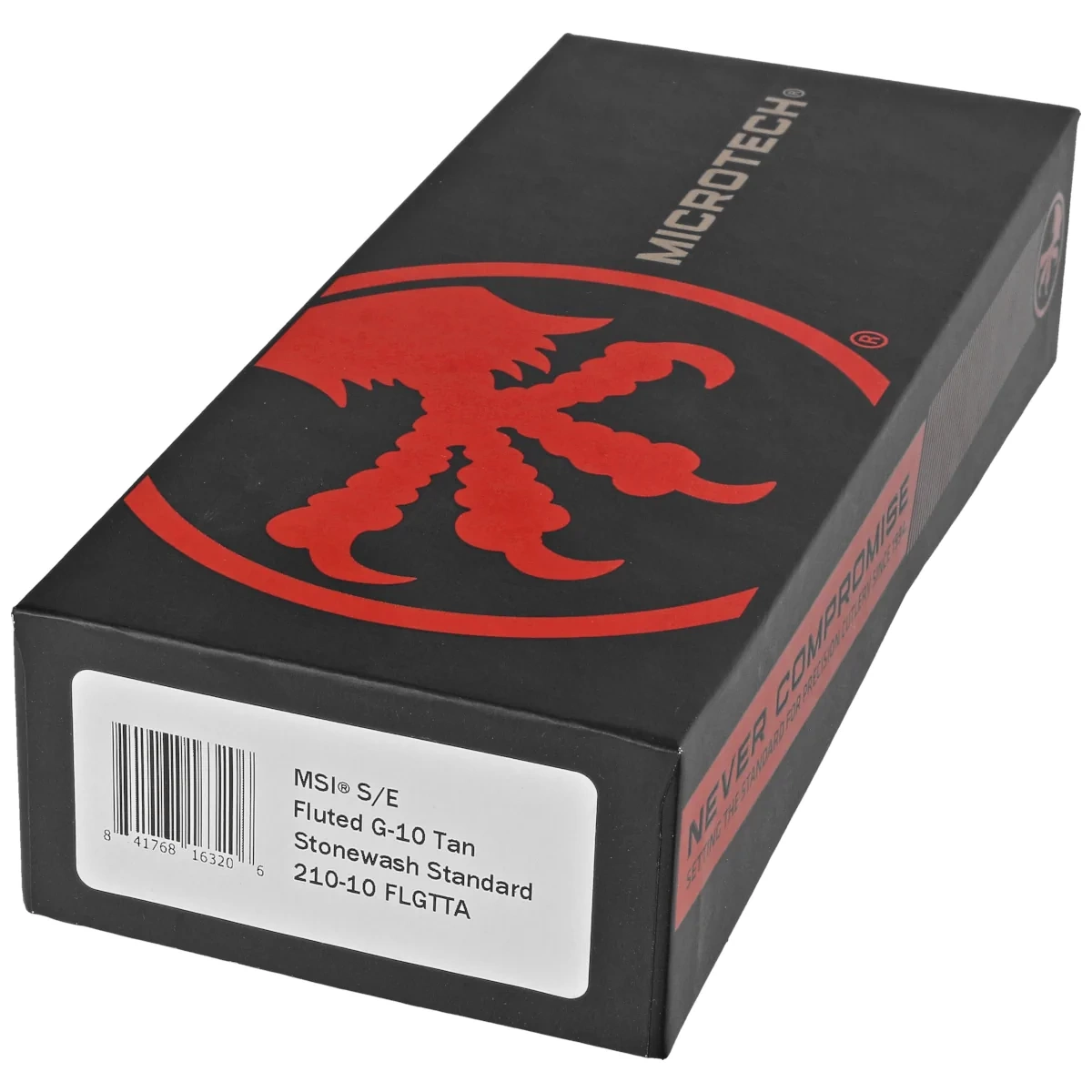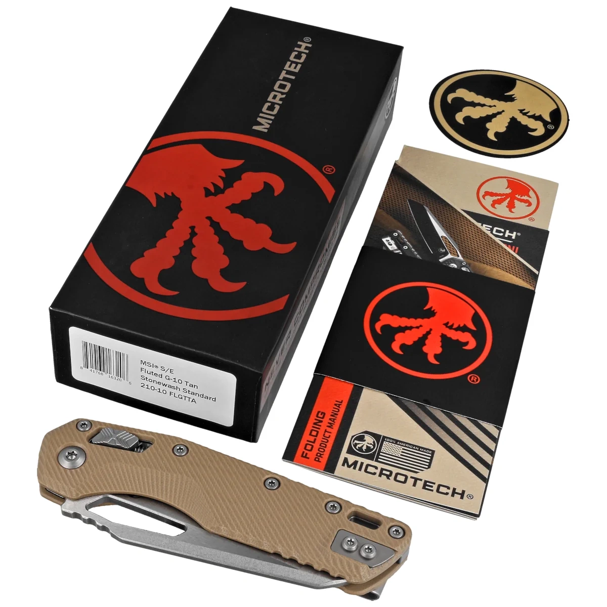 • MSI S/E Fluted Tan G10, Stonewashed strong folding knife with intuitive RAM-Lock. Superior M390MK blade steel, the result of collaboration between Microtech and Bohler engineers. Ergonomic G10 handle. Designed by Anthony Marfione of Microtech!