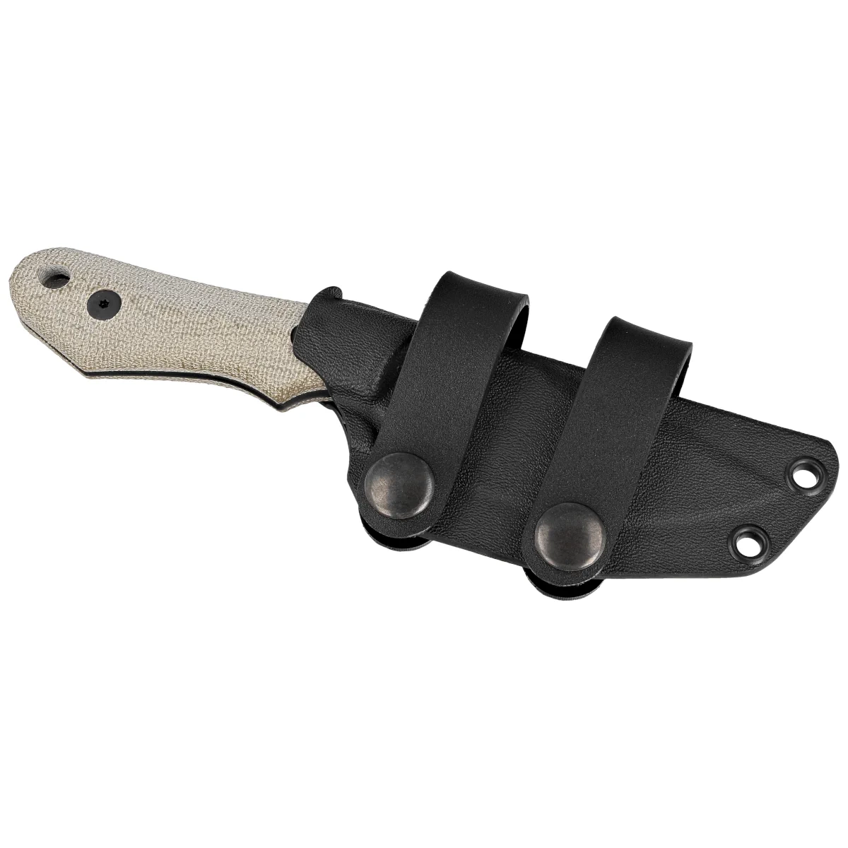 Handle - ergonomically profiled with finger notches. 3D machined grips made of Canvas Micarta composite (pressure-pressed canvas with synthetic resin) attached directly to the blank. This is the simplest and most secure design that ensures the practical indestructibility of the knife. The advantage of Canvas Micarta is its insensitivity to weather conditions, resistance to chemicals and mechanical damage, as well as its low weight. On the back of the Handle lanyard hole, a hole for belay or decorative rope.