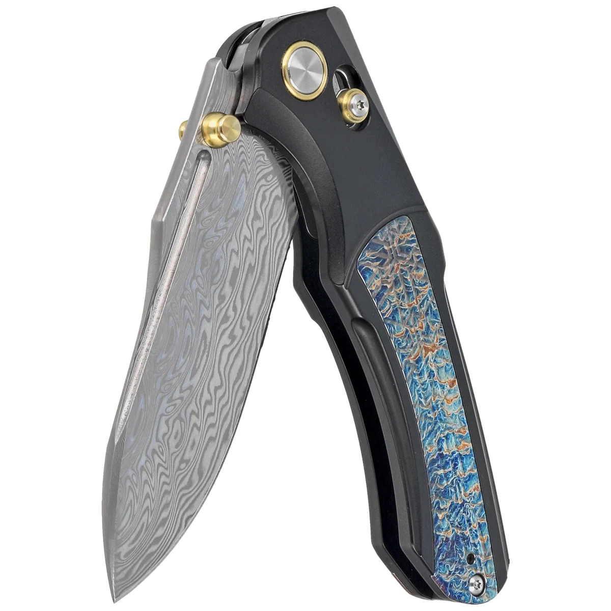 • Chameleon Black / Ligtning Storm Titanium, Color Damascus compact EDC folding knife. Blade made of colored damascus with a unique pattern, Handle made of titanium. Axle Lock for gravity opening!