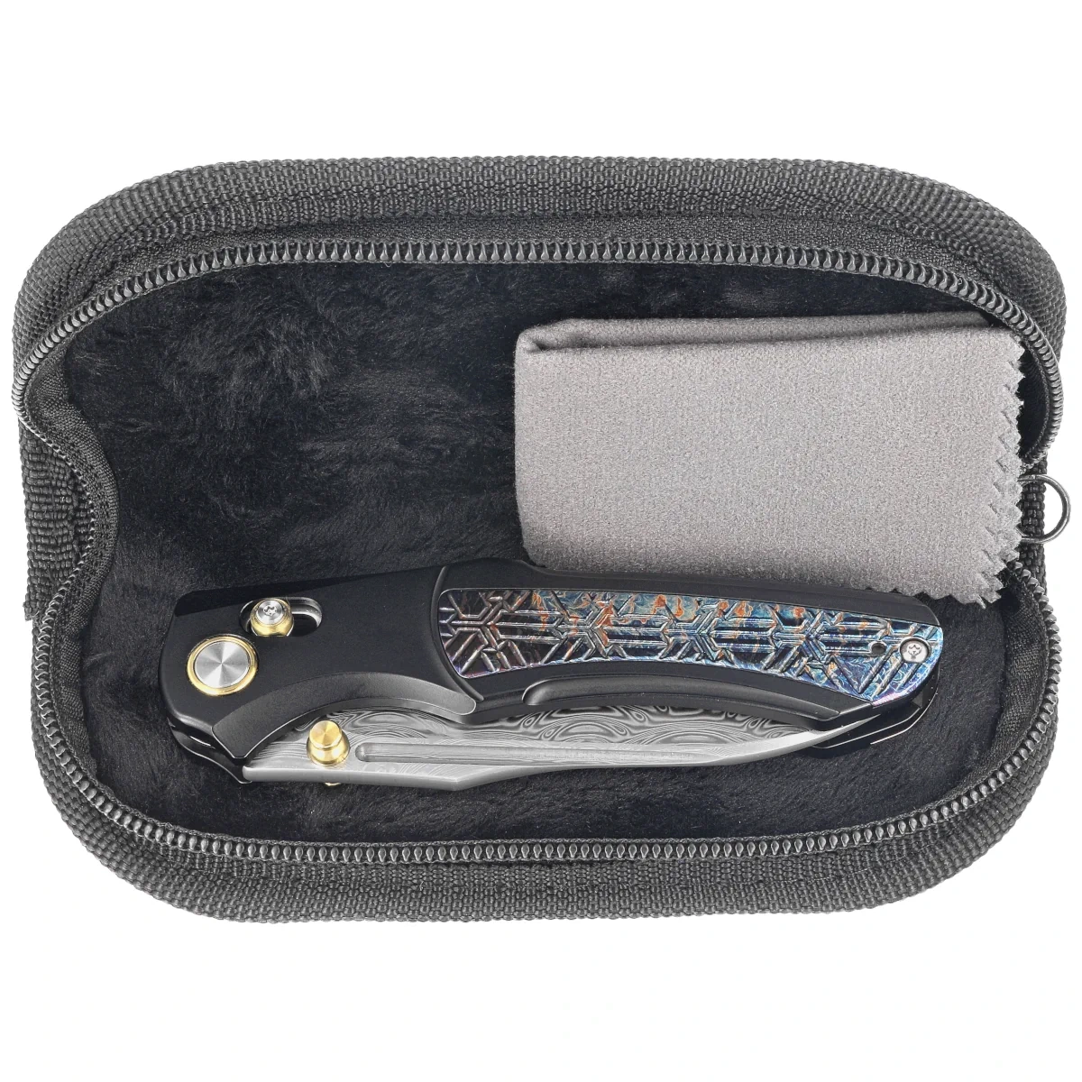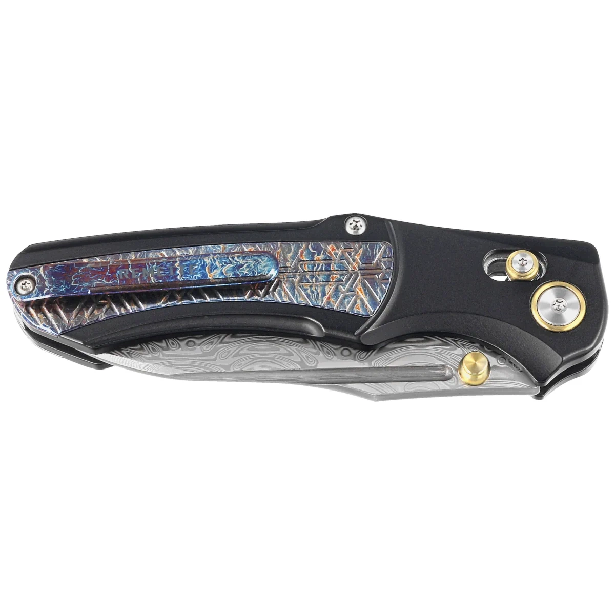 Handle - thick pieces of sandblasted titanium 6AL4V, beautifully milled using CNC machine tools , decorated with inlays (inlay) of titanium stained with Lightning Storm pattern . The titanium backspacer to which the grips are attached guarantees the rigidity and strength of the entire structure. The simplicity and solidity of the construction give the assurance of many years of use. The two-position clip (right/left), made of titanium, allows you to carry the knife in tip-up position. The decorative ring around the pivot, the so-called pivot collar, is made of gold anodized titanium.