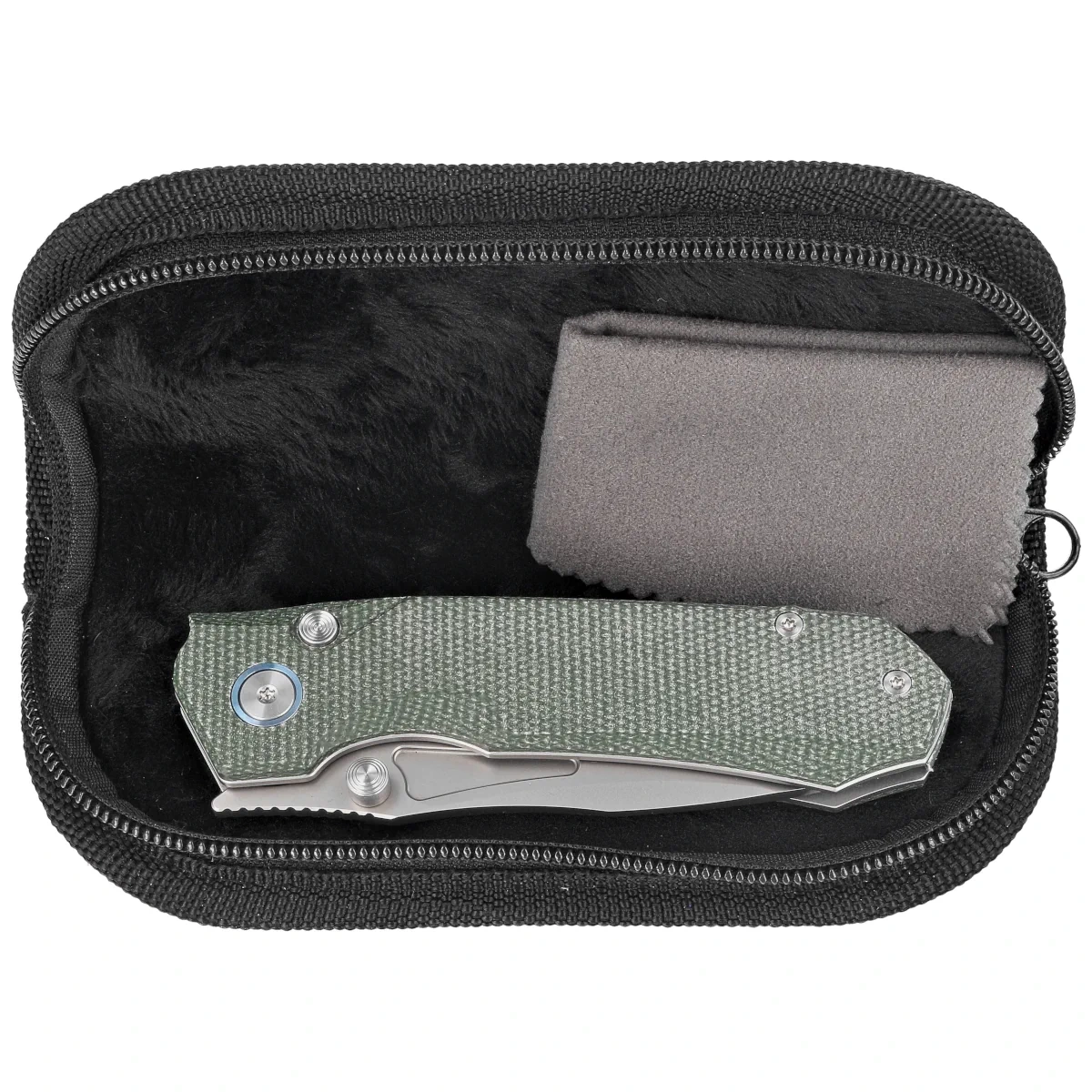 Handle - Linen Micarta (pressure-pressed linen with synthetic resin) grips, textured to improve grip confidence, bolted to the knife's steel frame. The solid backspacer to which the grips are attached guarantees the rigidity and strength of the entire structure. A single-position (right) steel deep-carry clip allows you to carry the knife discreetly in your pocket in tip-up position (blade tip up). The decorative ring around the pivot, the so-called pivot collar, is made of blue anodized titanium. The hidden recess of the backspacer contains a place for threading a safety or decorative cord.
