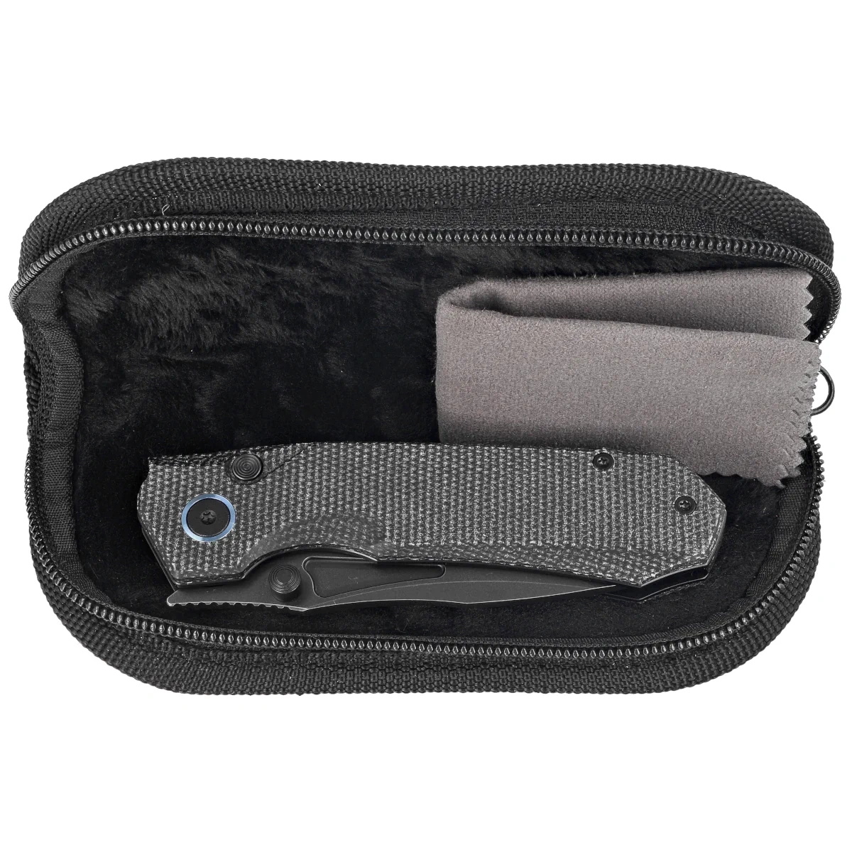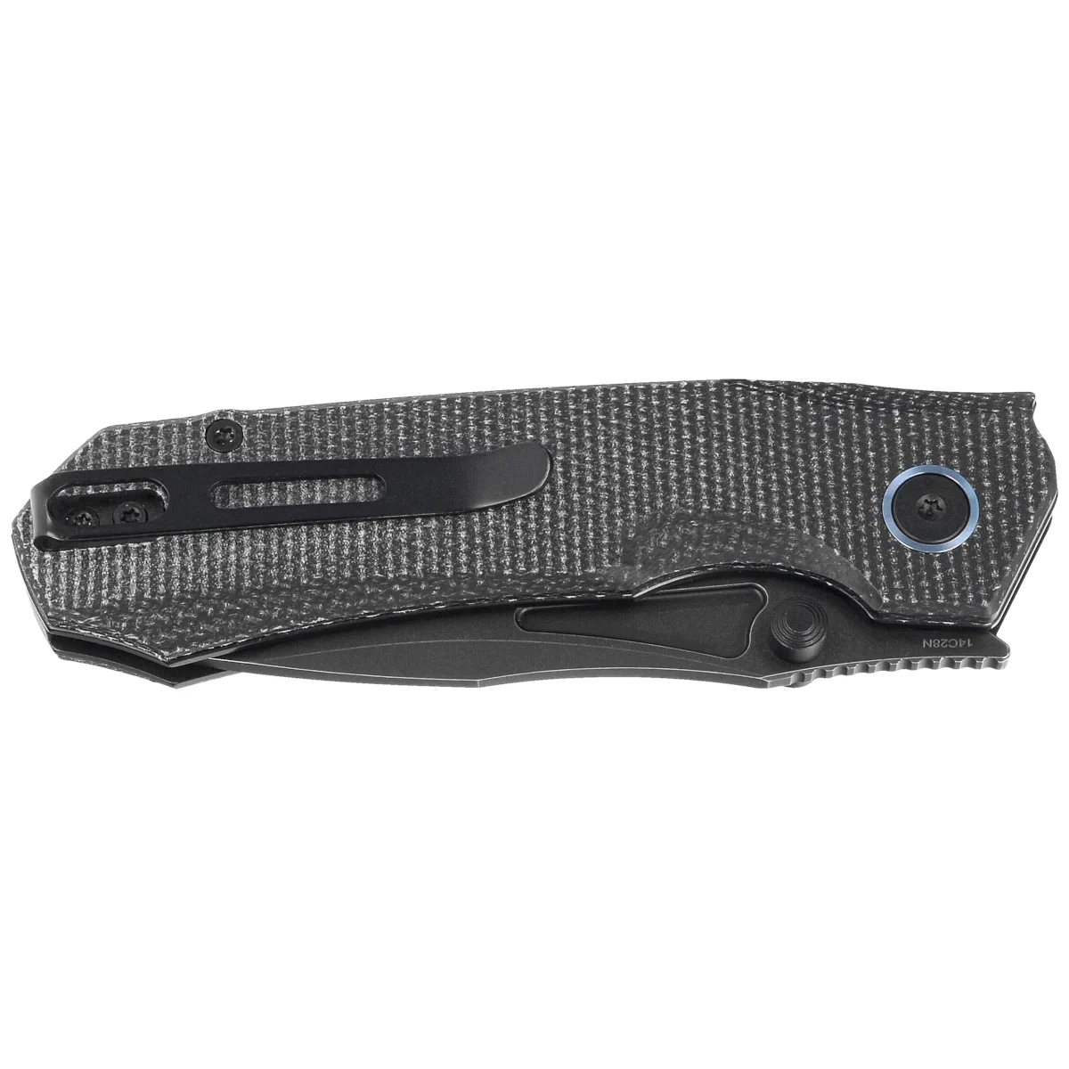 Handle - Linen Micarta (pressure-pressed linen with synthetic resin) grips, textured to improve grip confidence, bolted to the knife's steel frame. The solid backspacer to which the grips are attached guarantees the rigidity and strength of the entire structure. A single-position (right) steel deep-carry clip allows you to carry the knife discreetly in your pocket in tip-up position (blade tip up). The decorative ring around the pivot, the so-called pivot collar, is made of blue anodized titanium. The hidden recess of the backspacer contains a place for threading a safety or decorative cord.