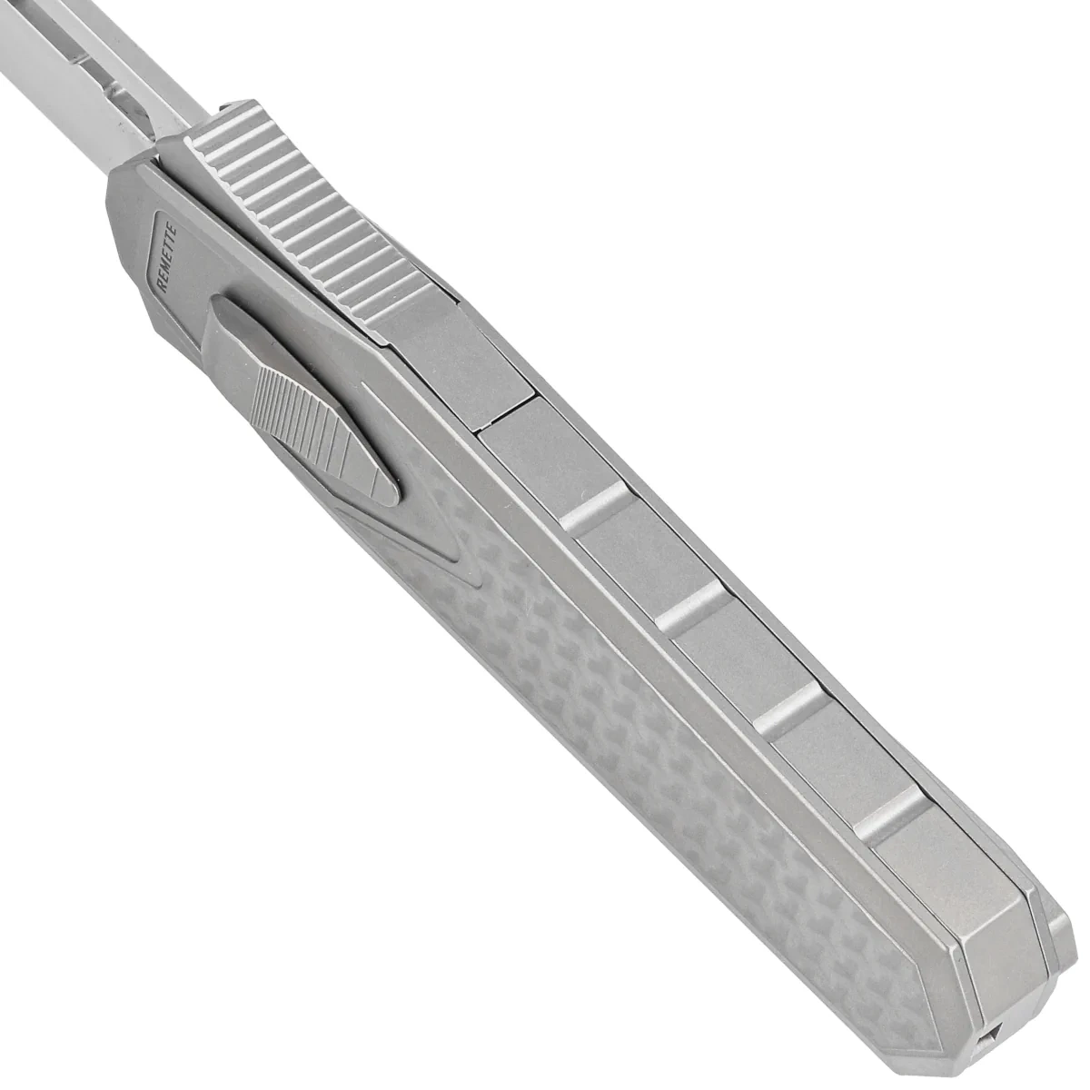 Handle - made on CNC milling machines from titanium, with three-dimensional texture. The chamfered edges of the covers eliminate sharp edges, and the perfectly matched inlay (inlay) made of green-yellow Carbon Fiber composite add an exclusive touch and improve grip security. On the right side, an artful slide for advancing/retracting the blade. A single-position titanium (right) deep-carry clip allows the knife to be carried discreetly in a pocket in tip-down position (blade tip down).