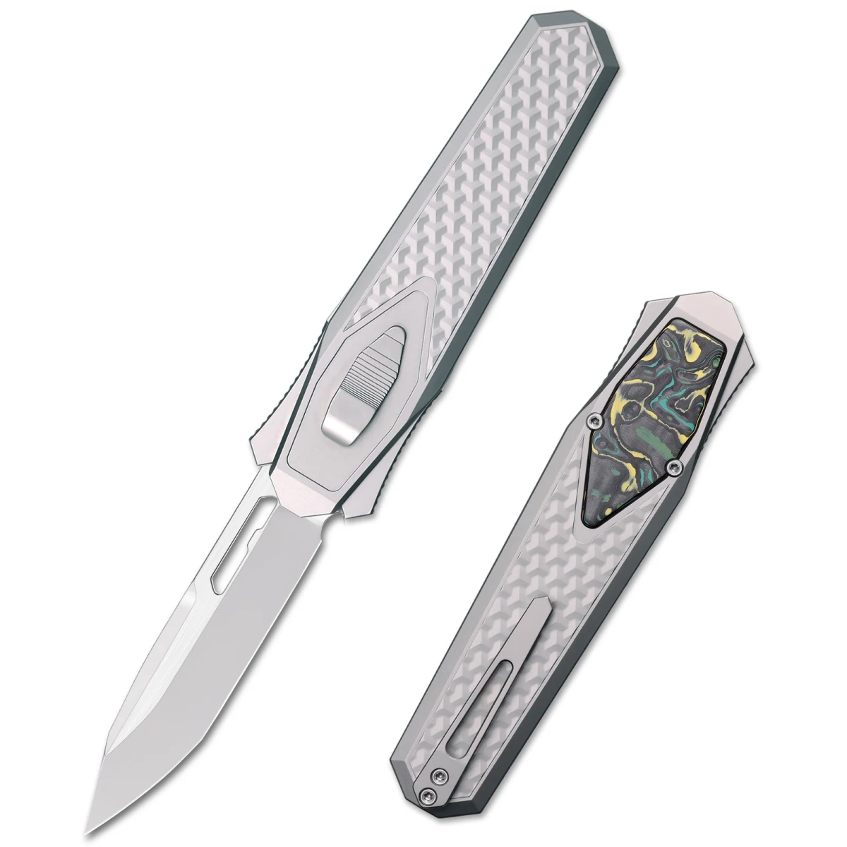 - Swordfish Titanium/Yellow Green Carbon Fiber, Pearlescent. An innovative knife from the young Remette Knives manufactory. OTF with an extendable blade made of Böhler M390 steel by gravity. Handle made of titanium with an smart blade release system.