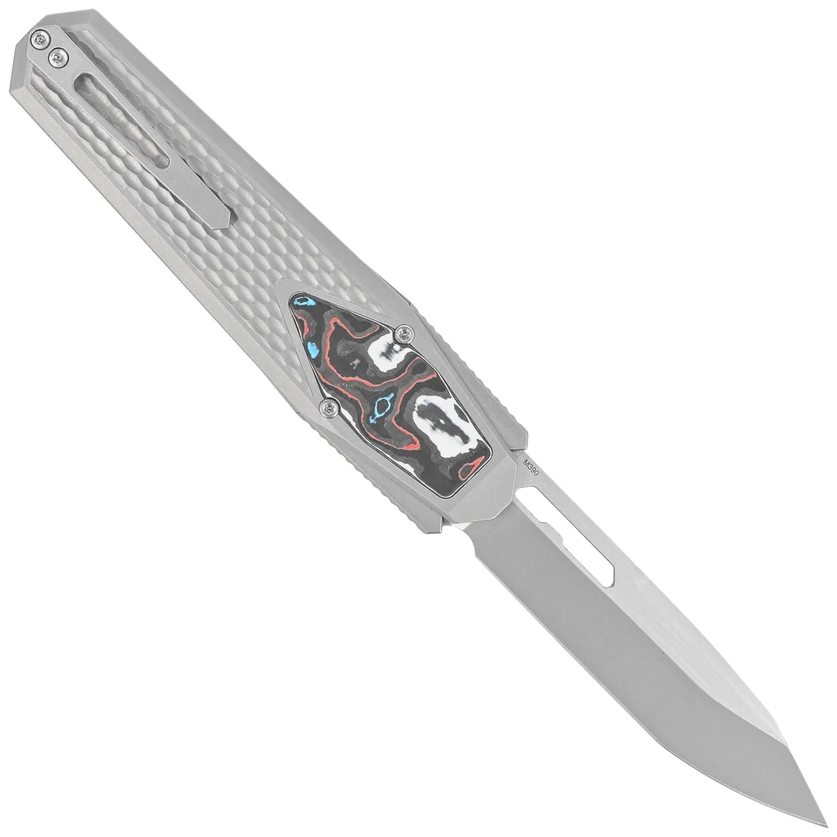 Handle - made on CNC milling machines from titanium, with three-dimensional texture. The chamfered edges of the covers eliminate sharp edges, and the perfectly matched inlay (inlay) made of red-blue Carbon Fiber composite add an exclusive touch and improve grip security. On the right side, an artful slide for advancing/retracting the blade. A single-position titanium (right) deep-carry clip allows the knife to be carried discreetly in a pocket in tip-down position (blade tip down).