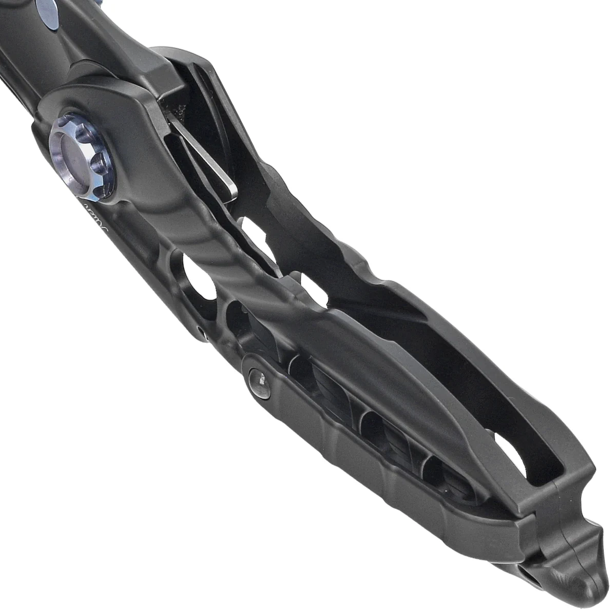 Handle - monolithic, made from a single piece of 6AL4V titanium milled with 3D CNC machine tools, coated with black DLC. This provides incredible strength, but requires the highest skill and precision in production. Chamfered cover edges and fore finger groove eliminate sharp edges and improve ergonomics of the grip. On the back of the Handle, stylized circles which, with holes milled below, bring to mind a fragment of Alien's skeleton. The pivot is decorated with a stylized Rike Knife brand logo. A single-position (right) deep-carry clip equipped with a smooth rollerball, thanks to which the knife easily slides into the pocket without damaging its edges, allows you to carry the knife discreetly in your pocket in the tip-up position (with the tip of the blade up).
