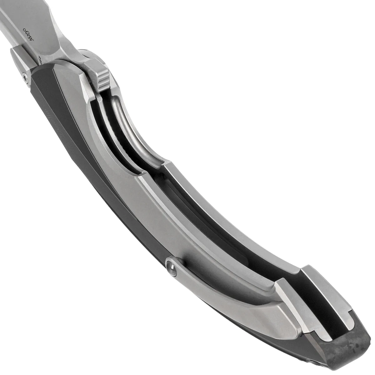 Handle - 6AL4V titanium exoskeleton on which is mounted a monolithic housing beautifully milled using CNC machine tools from a single piece of titanium. The innovative design provides outstanding solidity and resistance. In the rear part you will find a locking slide, thanks to it you have the possibility to remove the outer casing, for example, to clean the knife. Single-position (right) deep carry clip equipped with a smooth rollerball, thanks to which the knife easily slides into the pocket without damaging its edges, allows you to carry the knife discreetly in your pocket in tip-up position (blade tip up).