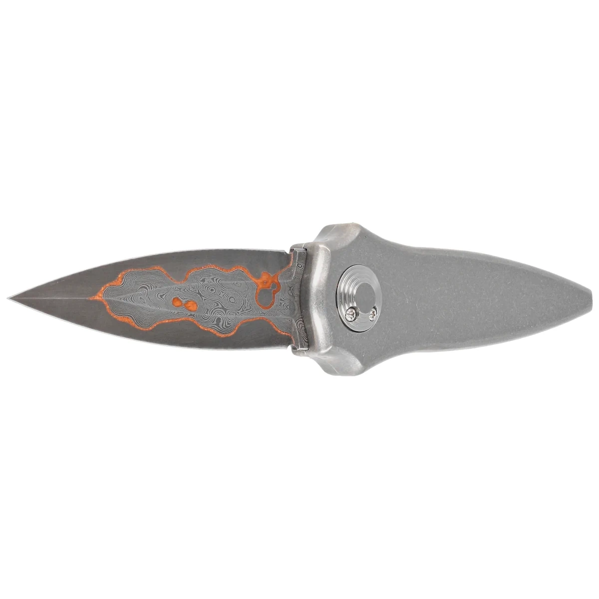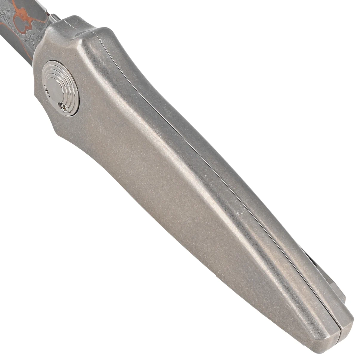Warlock Smooth Gray Titanium, Damascus Baker Forge Raindrop Gomai Copper Shim 80CRV differs from traditional folding knives by using an innovative opening mechanism. The large, textured pivot serves as a double locking button. By pressing both sides of the pivot at the same time, the Handle splits, exposing the Blade; through gravity and wrist movement, the Blade will slide out to the open position. This is a fun and innovative opening mechanism, effective and also provides a solid lock. The Warlock knows how to get down to business and will work as long as you want it to, but it's also capable of satisfying your thirst for fun. It's a knife you'll always be happy to have with you.
