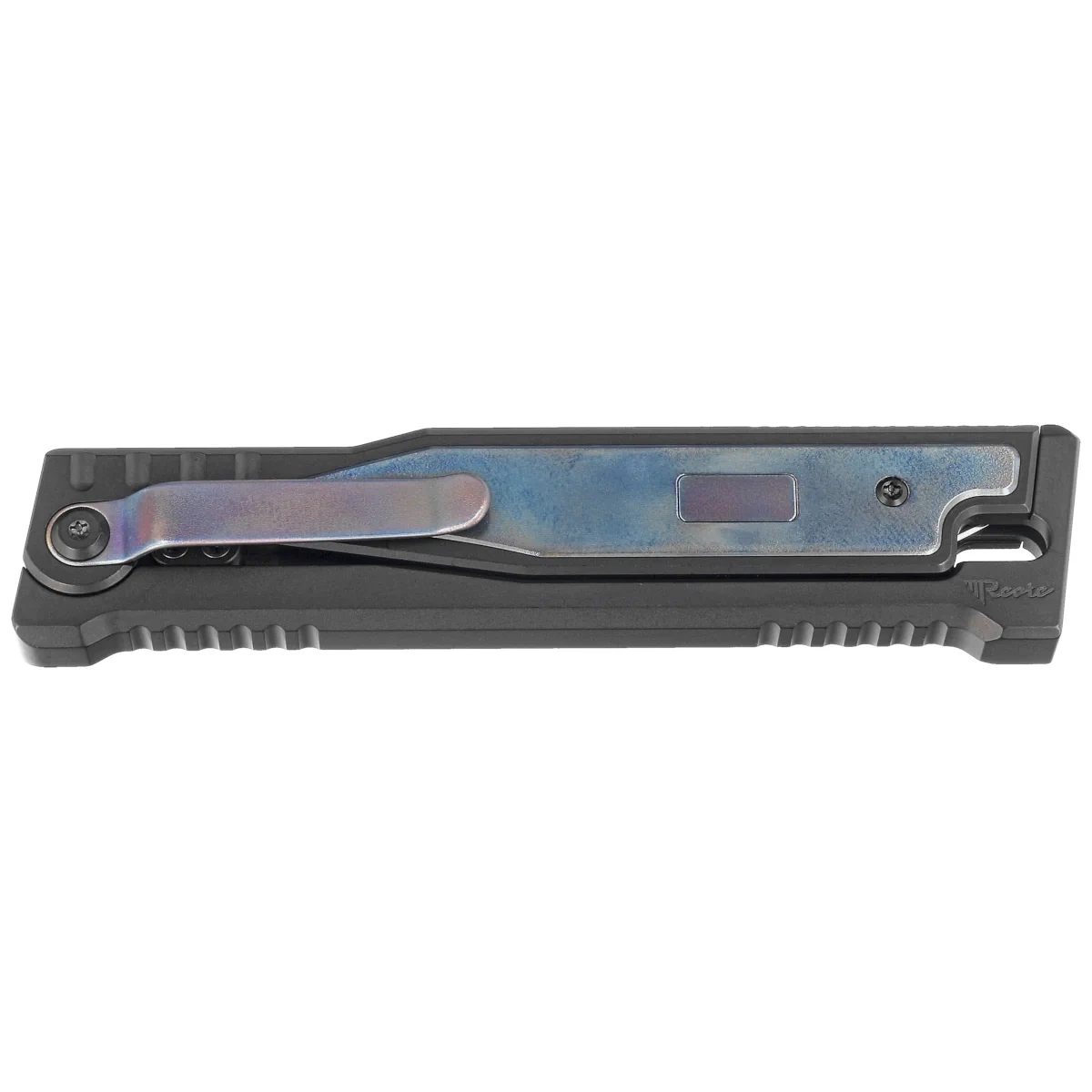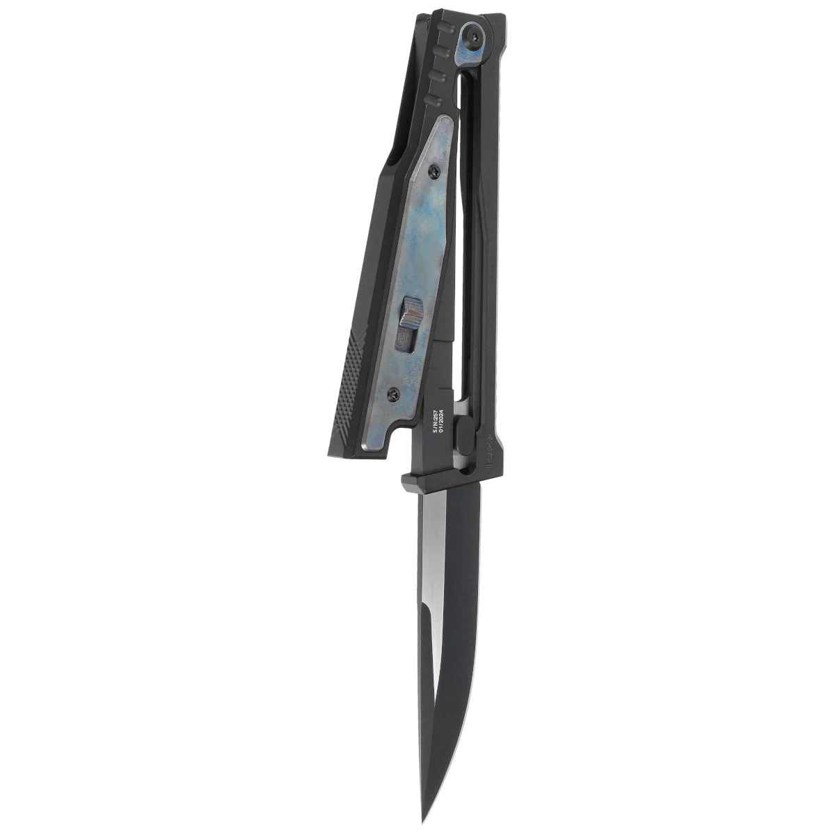 Handle - CNC-milled titanium Exoskeleton, an outer skeleton with a movable top section responsible for opening and closing the knife. The chamfered edges of the sheaths eliminate sharp edges, and the perfectly matched inserts made of heat-dyed titanium improve grip security. On the right side, an artful knife opening lock slider. Once it is moved to the secure "lock" position, the knife will not be opened/closed by accident. A single-position titanium (right) deep-carry clip allows you to discreetly carry the knife in your pocket in the tip-down position (blade tip down).