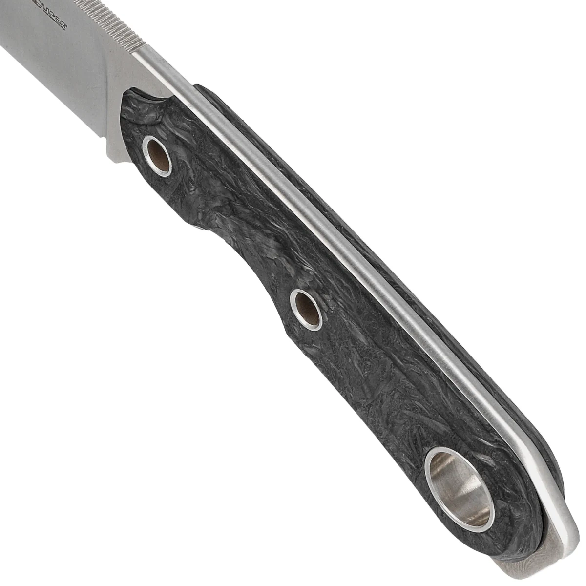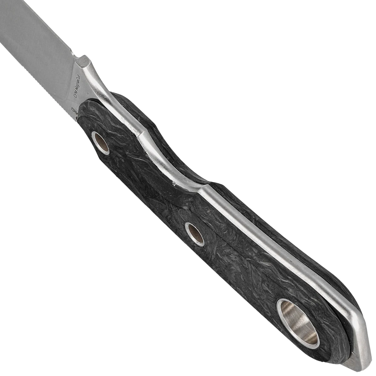 Handle - made of Dark Matter Carbon Fiber composite , riveted directly to the blade, provides virtually indestructible construction. The rounded shape of the covers eliminates sharp edges. The unique ergonomics of the Handle allows the knife to be held both ways, especially for users who appreciate an inverted grip. On the back of the Handle an enlarged lanyard hole, which is a hole for attaching a belaying line. The protruding part of the lanyard can be used to light a fire with a flint or as a glass breaker.