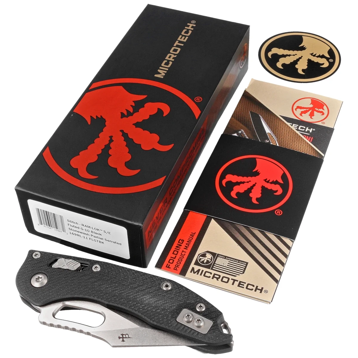 • Stitch Ram-Lok S/E Black Fluted G10, Stonewashed P/S manual version of the popular design by Sebastijan Berenjie of Borka Blades and Microtech. Wide harpoon-shaped blade, superior materials and legendary quality workmanship from Microtech Knives.
