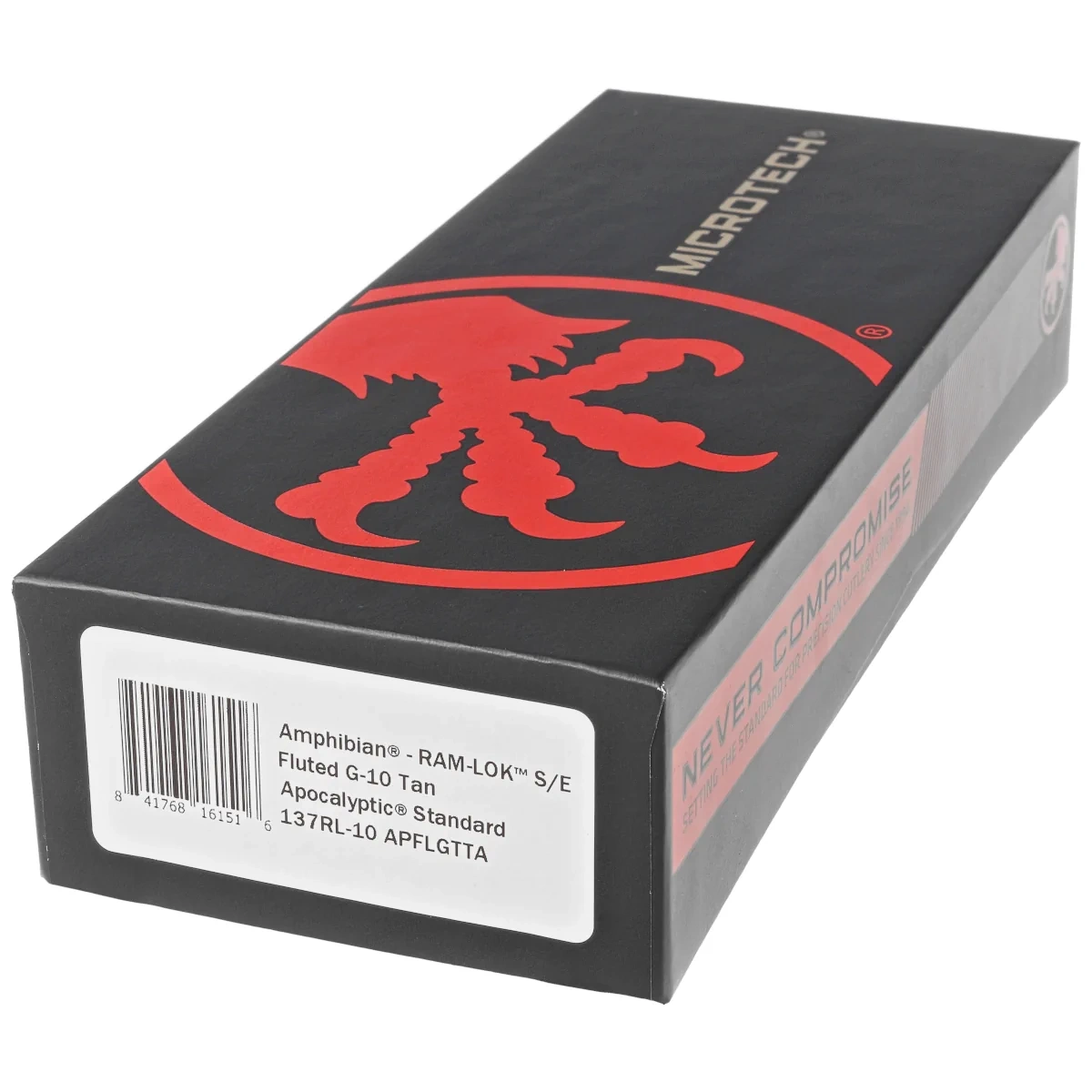 • Amphibian Ram-Lok S/E Fluted Tan G10, Apocalyptic reissue of folding knife with intuitive RAM-Lock. Superior M390MK blade steel, the result of collaboration between Microtech and Bohler engineers. Ergonomic Handle. Designed by Tony Marfione of Microtech