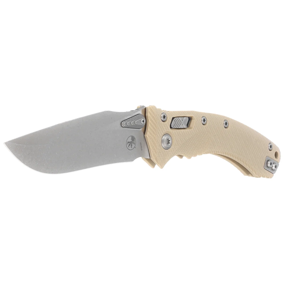 Handle - made of durable G10 composite, covered with milled lines (Fluted) for better grip. Wide locking slide with Microtech's characteristic stepped X structure. Both grips have been screwed together with a solid backspacer. A double-sided (right / left) titanium clip allows you to discreetly carry the knife in tip-up position. Above the clip a lanyard hole, a place for a safety or decorative cord.