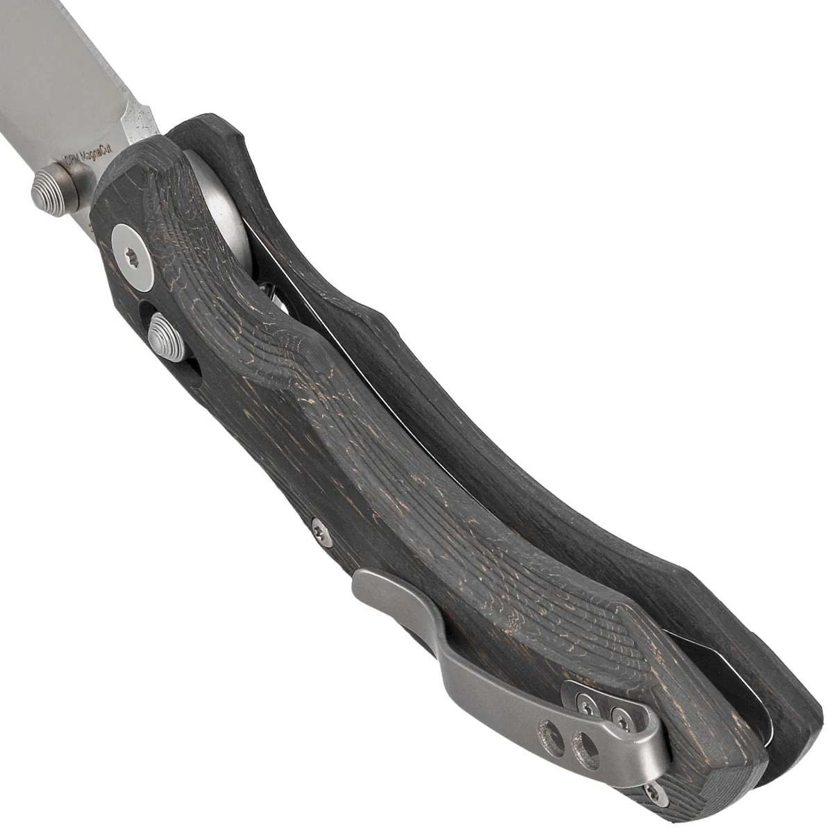 Handle - made of Light Carbon Fiber composite, a virtually indestructible plastic that is insensitive to weather, resistant to chemicals and mechanical damage, beautifully milled using CNC machine tools. The so-called open-backed design fixed with steel spacer sleeves reduces weight and facilitates cleaning. The simple, secure design gives assurance of many years of use. Single-position clip (right), made of titanium, allows the knife to be carried in tip-up position.