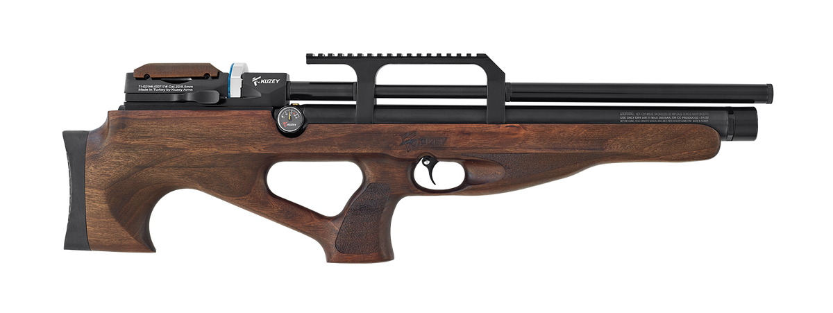 Kuzey is a Turkish manufacturer known for producing high-quality PCP air rifles. All rifles from this brand come standard with a barrel featuring an integrated moderator, a power adjustment regulator, and a customizable trigger mechanism. The Kuzey K400 is an air rifle with a bullpup-style stock made of Turkish walnut and a side lever cocking system. It is available in calibers 4.5 mm, 5.5 mm, and 6.35 mm.