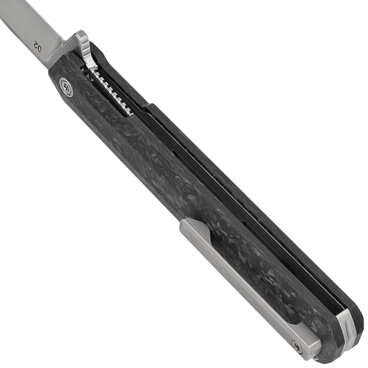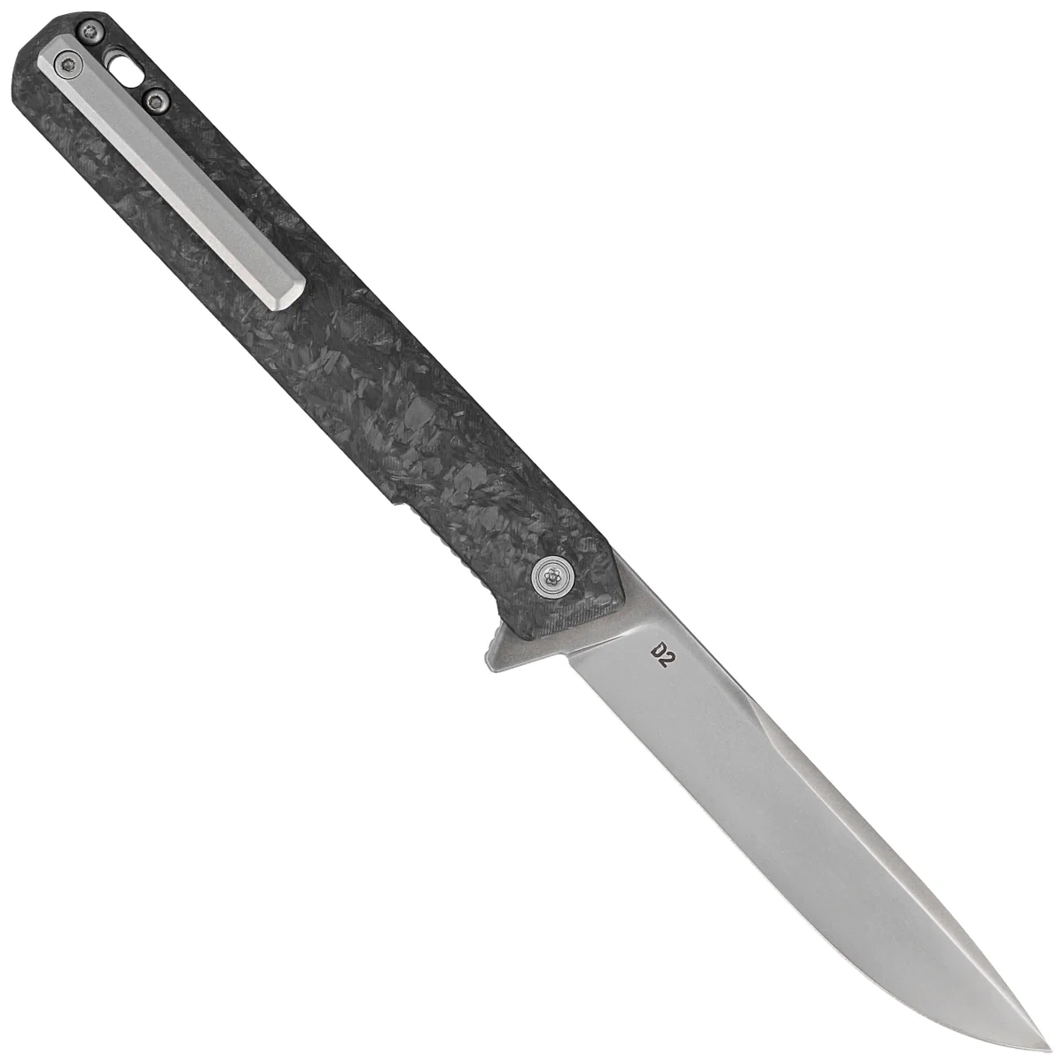 • F2 Bravo Black Forged Carbon Fiber, Silver HW/Clip, Satin compact folding knife from Tekto Knives. Utilitarian blade made of D2 tool steel, solid Carbon Fiber composite grips. Lightweight and durable, you can carry it comfortably in the included pouch.