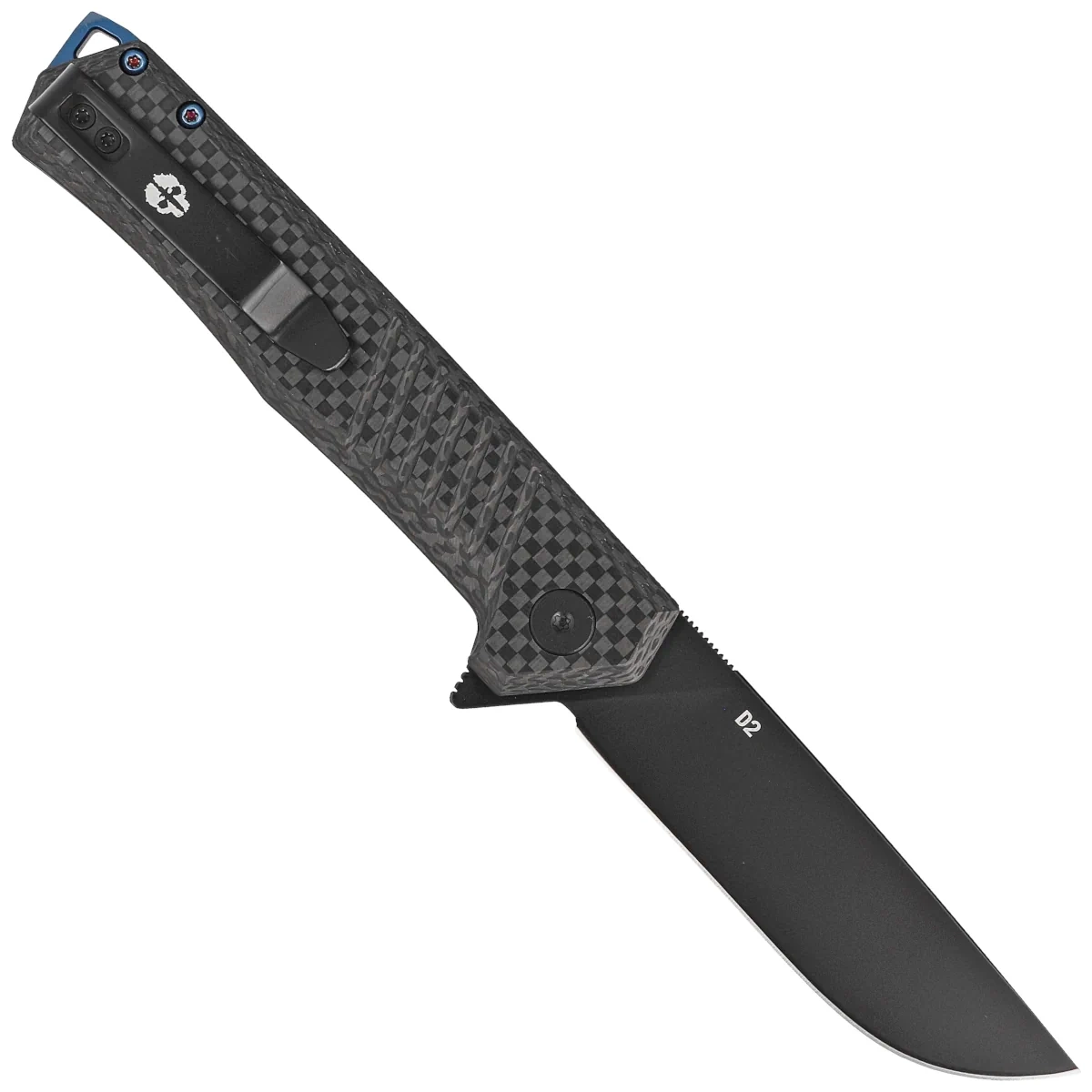 • F1 Alpha Black Carbon Fiber, Blue HW, Black universal folding knife from Tekto Knives. Utilitarian blade made of D2 tool steel, solid Carbon Fiber composite grips. It will work well on the battlefield, in the woods, camping or in the workshop.