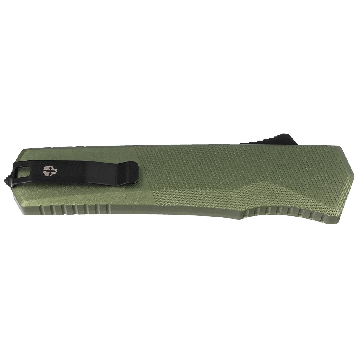 A5 Spry D/P OD Green Aluminum, Black is Tekto's most advanced OTF automatic knife, designed for professionals who value reliability and precision. The Handle is made of high quality 6061-T6 aluminum, precisely contoured, providing a secure grip and excellent control of the tool, even in the most demanding conditions. The S35VN steel blade, highly hardened (60-62 HRC), guarantees unparalleled cutting performance and long-lasting sharpness retention. Compact and lightweight, weighing just 98 grams, the A5 Spry is almost invisible in a pocket, making it an ideal choice for those in need of a discreet yet ready-to-use tool. The automatic blade ejection mechanism, activated by an ergonomically placed button, ensures instant and reliable operation. A5 Spry is not only a tool, but also an expression of the highest quality workmanship and innovative design, which will meet the expectations of even the most demanding users. Its tactical nature, combined with an elegant design, makes it an indispensable piece of equipment for any professional.