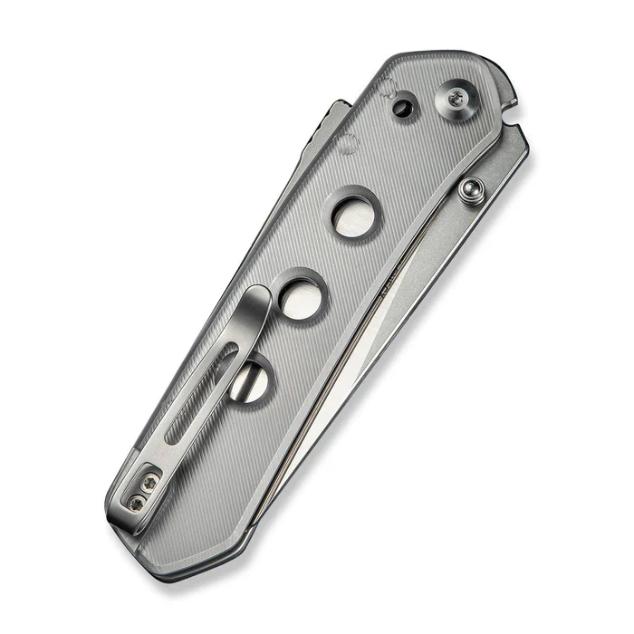 Handle - beveled grips made of polished, transparent Lexan™ plastic, attached to stainless steel liners. The simplicity and sturdiness of the design give assurance of many years of use. The grip has been relieved by a series of holes in the center of the liners. A two-position (right/left) clip allows the knife to be carried in tip-up position. There is a hole in the back for threading a safety or decorative cord. As in other models, the pivot is decorated with a stylized manufacturer's logo.