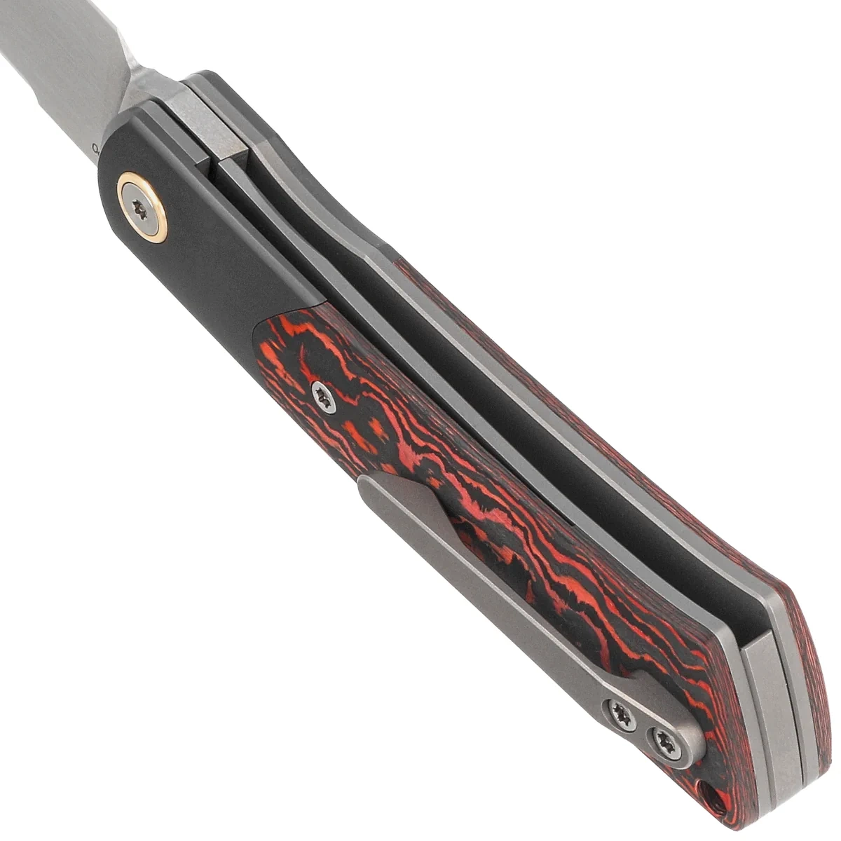 Handle - 6AL4V titanium skeleton , to which a zirconium bolster and Lava Flow Fat Carbon composite wraps are attached. Contouring of the covers eliminates sharp edges. Only a few companies are able to make a Handle with such incredible accuracy! The grips are joined together using a titanium backspacer covered with upper jimping. Single-position clip (right), made of titanium, allows to carry the knife in tip-up position.