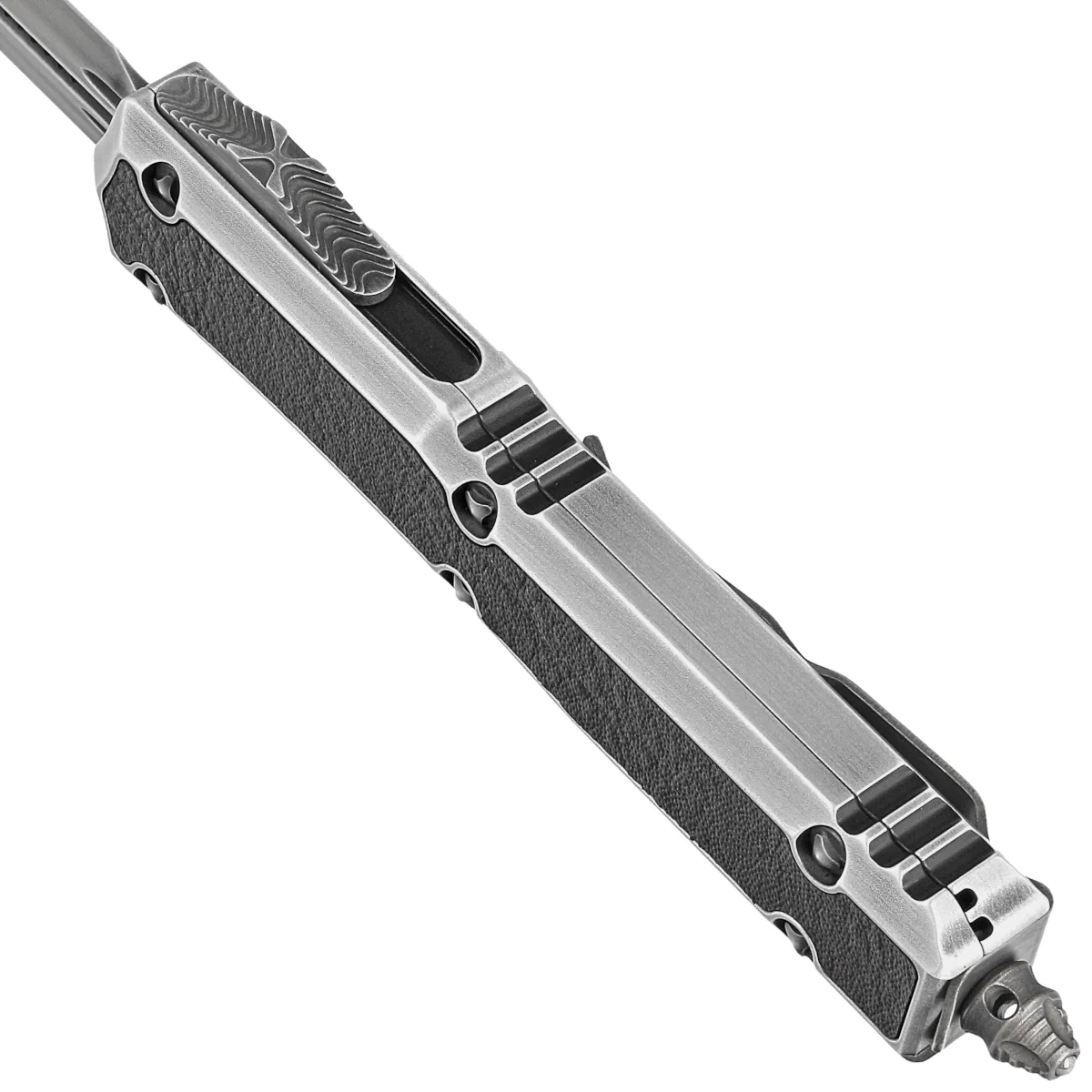 Microtech Makora D/E Signature OTF Knife Silver Distressed Aluminium/Leather, Black Stonewashed M390 by Tony Marfione (206-1MD)