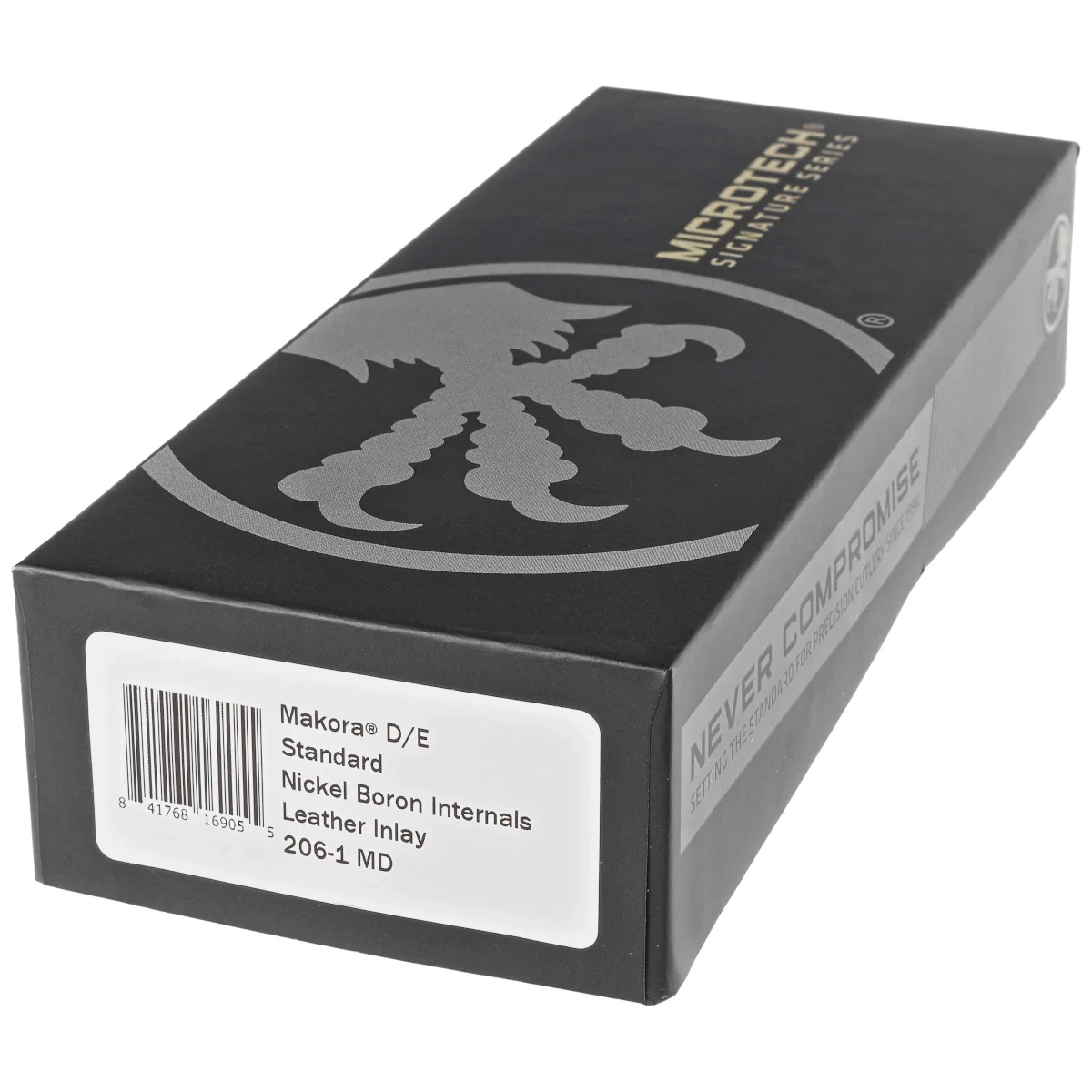 • Makora D/E Signature Silver Distressed Aluminum/Leather, Black Stonewashed is a full-size OTF automatic knife. Operating in D/A mode, it features a hell of a fast blade extension mechanism. Designed by Tony Marfione owner of Microtech Knives