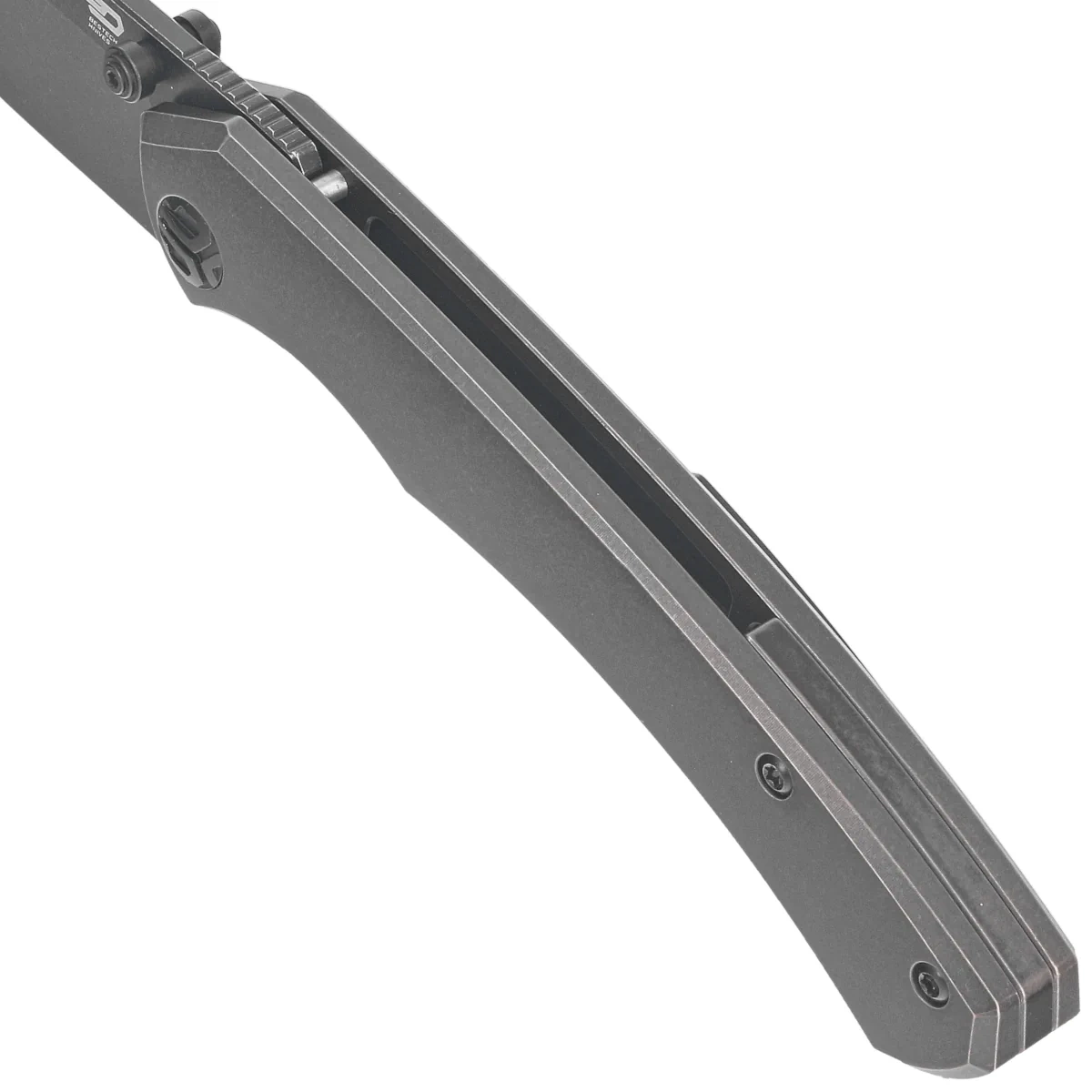 Handle - is two pieces of solid titanium 6AL4V, lapped on the edges. The chamfered edges of the covers eliminate sharp edges for comfort, and the fore finger groove improves grip security. The titanium backspacer to which the grips are attached guarantees the rigidity and strength of the entire construction. A single-position, right-handed titanium clip allows the knife to be carried in tip-up position , with the tip of the blade upward.
