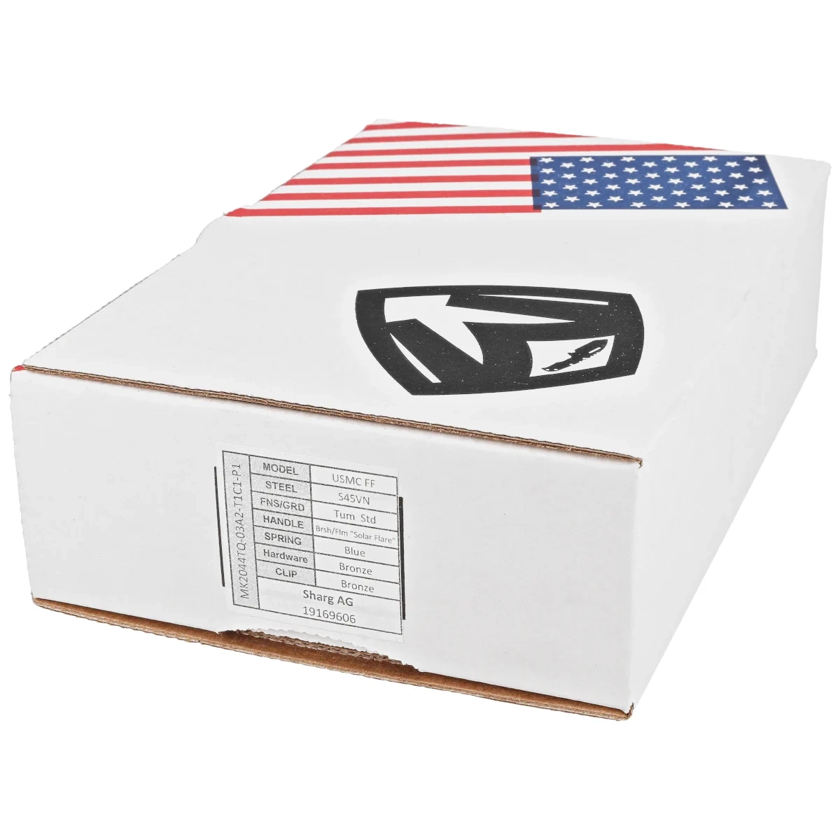 The USMC Fighter Flipper “Solar Flare”/Blue Titanium, Bronze HW/Clip, Tumbled features a machine-finished Blade with a “tumbled” finish, handcrafted concave grinds give excellent cutting characteristics combined with high strength. The striking embossing increases the strength, using them to open the knife. We can also use a flipper flipper, which when opened forms a guard to protect our hand, For increased insensitivity to contamination, phosphor bronze washers were used, making the pivot axis more resistant to field work. A powerful titanium frame lock bar secures the knife from folding, unfolded and secured the knife is as solid as an armored cash register.