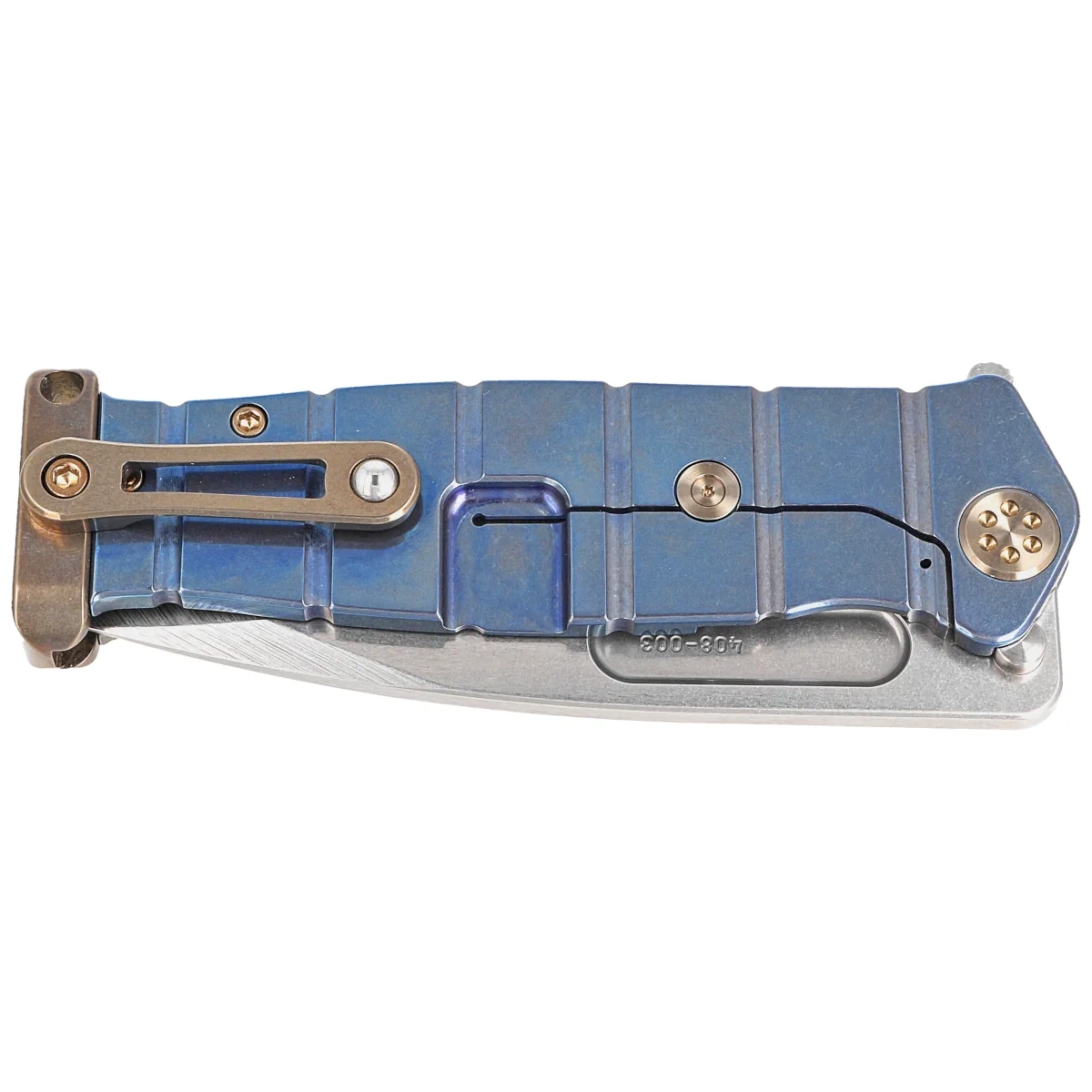 Handle made of titanium, presentation side flame-dyed with “Solar Flare” pattern , lock side anodized blue. The massive head on the back of the Handle is responsible for balance and balance, and can also be used as an improvised hammer or glass breaker. The whole is completed by a unique in form clip, of course, also made of titanium. The bolts, head and clip dyed bronze contrast beautifully with the blue handle.
