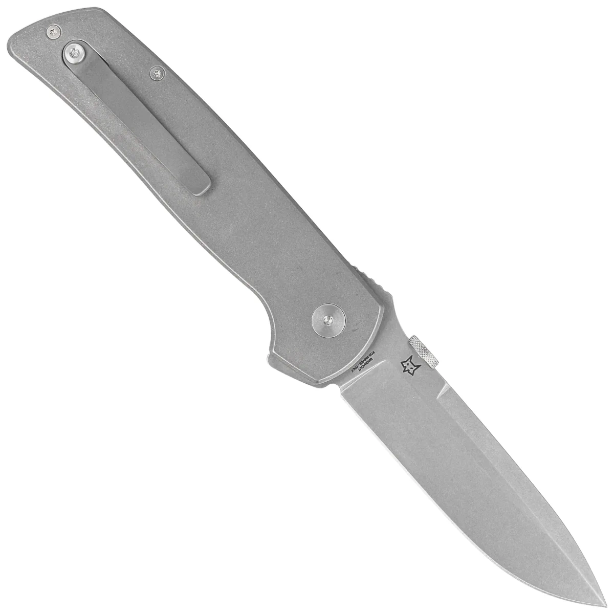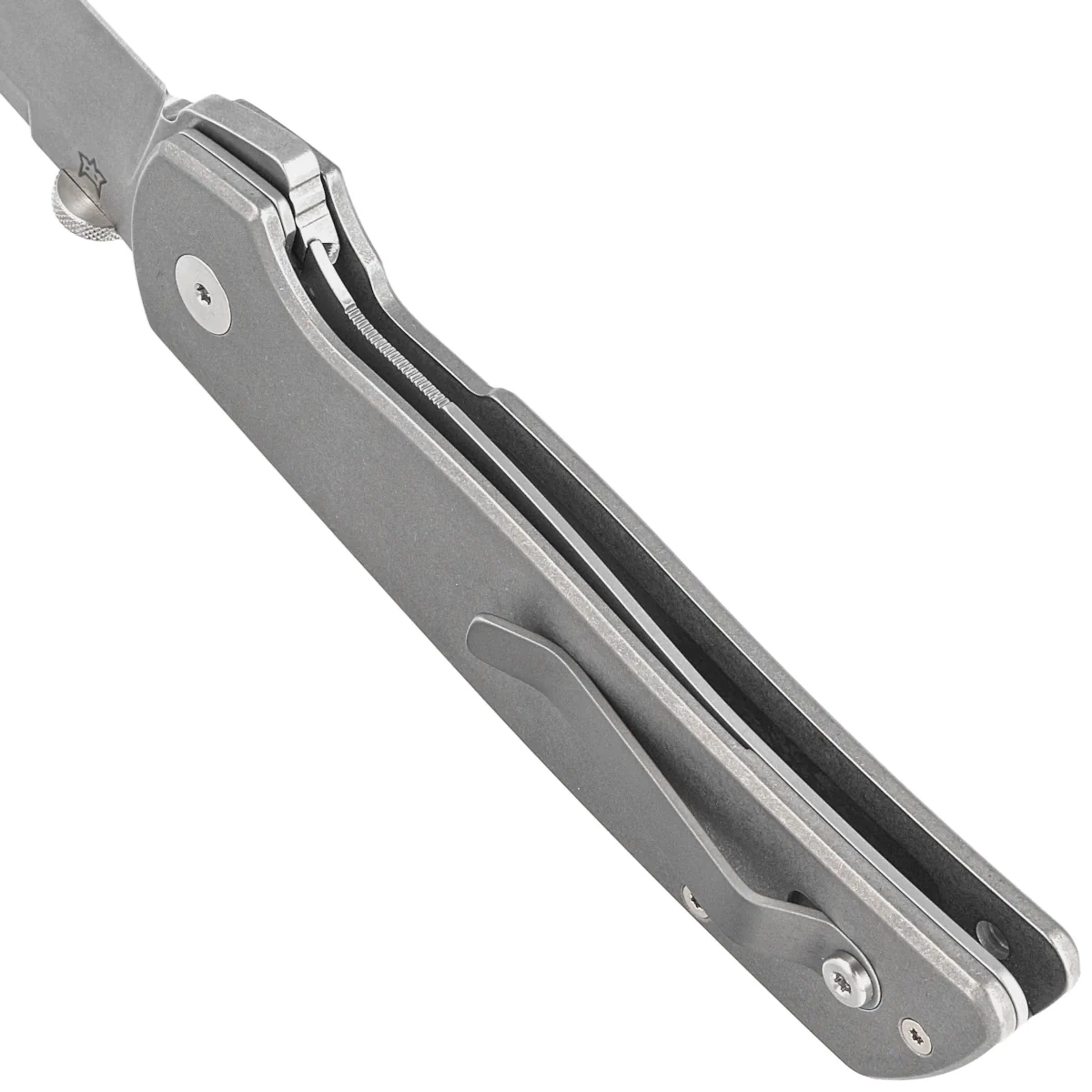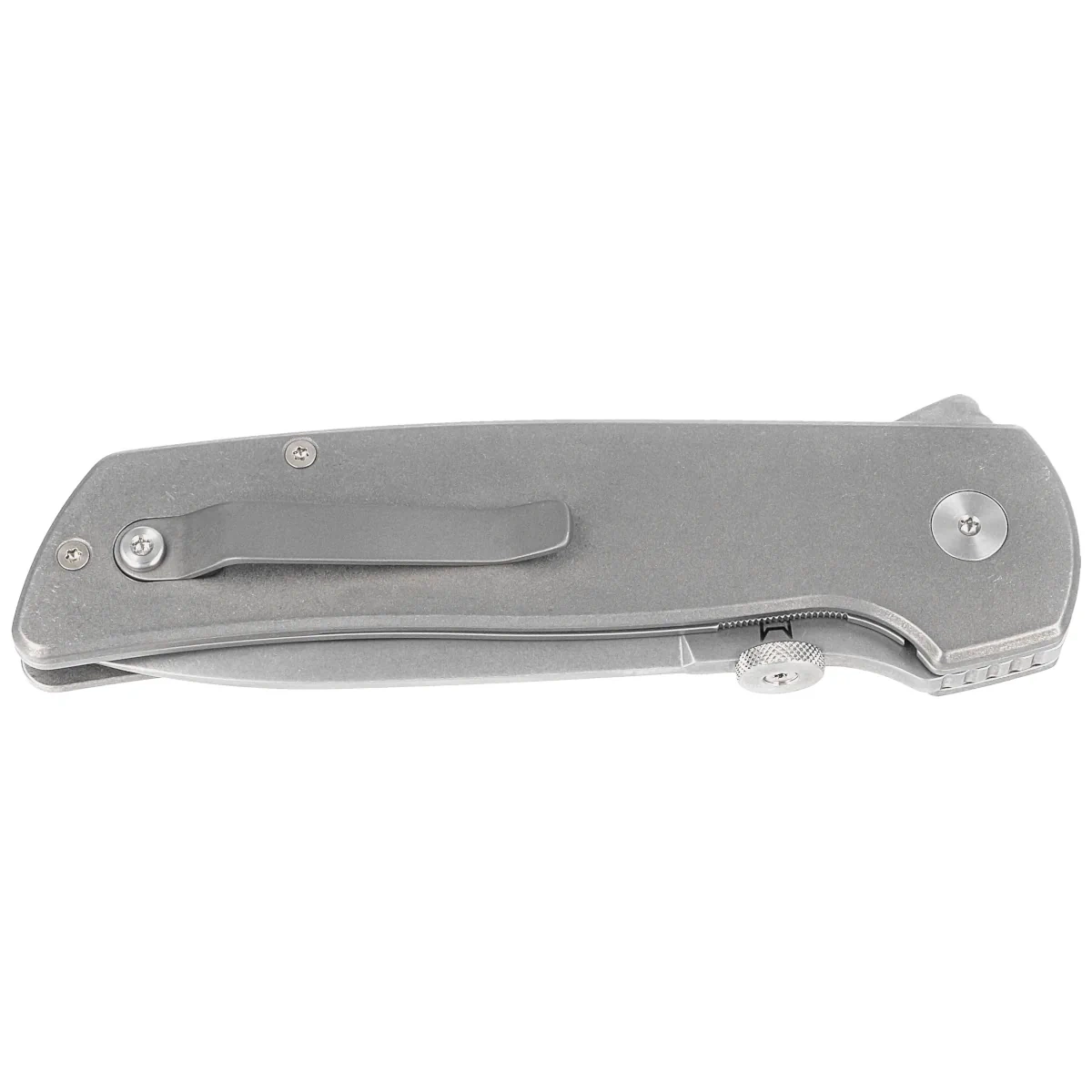 Handle - beveled grips made of sandblasted titanium, a virtually indestructible metal insensitive to weather conditions, resistant to chemicals and mechanical damage, slightly profiled. The massive backspacer to which the grips are attached guarantees the rigidity and strength of the entire structure. The simple, solid construction gives the assurance of many years of use. One-position (right) titanium clip allows you to carry the knife discreetly in your pocket in tip-up position (blade tip up).