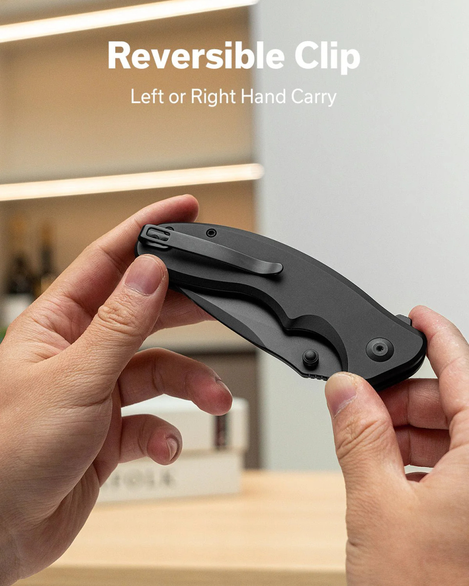 Handle - made of high-quality aircraft-grade aluminum. Contouring of the covers eliminates sharp edges, and the fore finger groove made on the front improves grip security. Open-backed design fixed with steel spacer sleeves reduces weight and facilitates cleaning. Two-position, right/left deep carry clip allows you to carry the knife discreetly in your pocket in tip-up position (blade tip up).