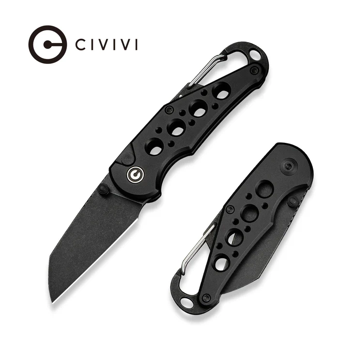 Handle - made of aluminum, whose beveled edges of the covers eliminate sharp edges for comfort, and the fore finger groove made on the front improves grip security. A series of holes in the Handle further relieve pressure on the knife and improve grip. The pivot is decorated with a stylized Civivi brand logo . The Handle is finished with a snap hook, which allows the knife to be clipped to a trouser loop or hooked to the belts of your equipment. It also serves as a bottle opener.