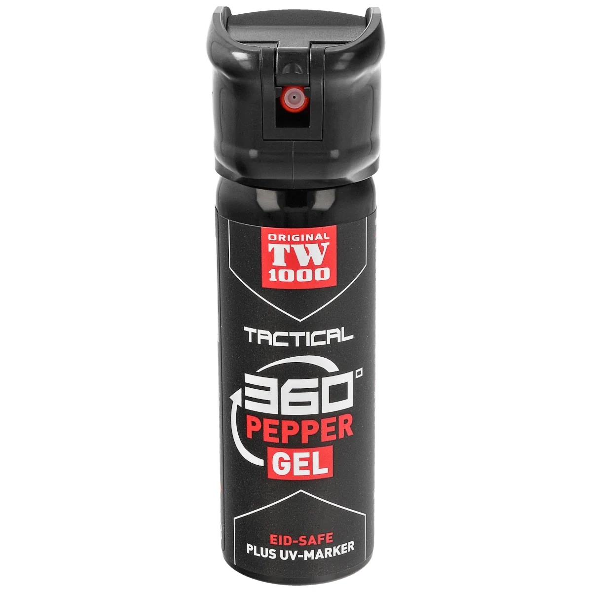 TW1000 Tactical - a series of high-strength pepper sprays with flip-top safety caps, designed for professional use. Developed by Hoernecke based on knowledge gained through years of cooperation with the police. Key features include 360° Allround® technology, allowing the active substance to be sprayed at any angle, even upside down, a non-flammable propellant formula, and a UV marker to tag and identify attackers, visible under UV light.