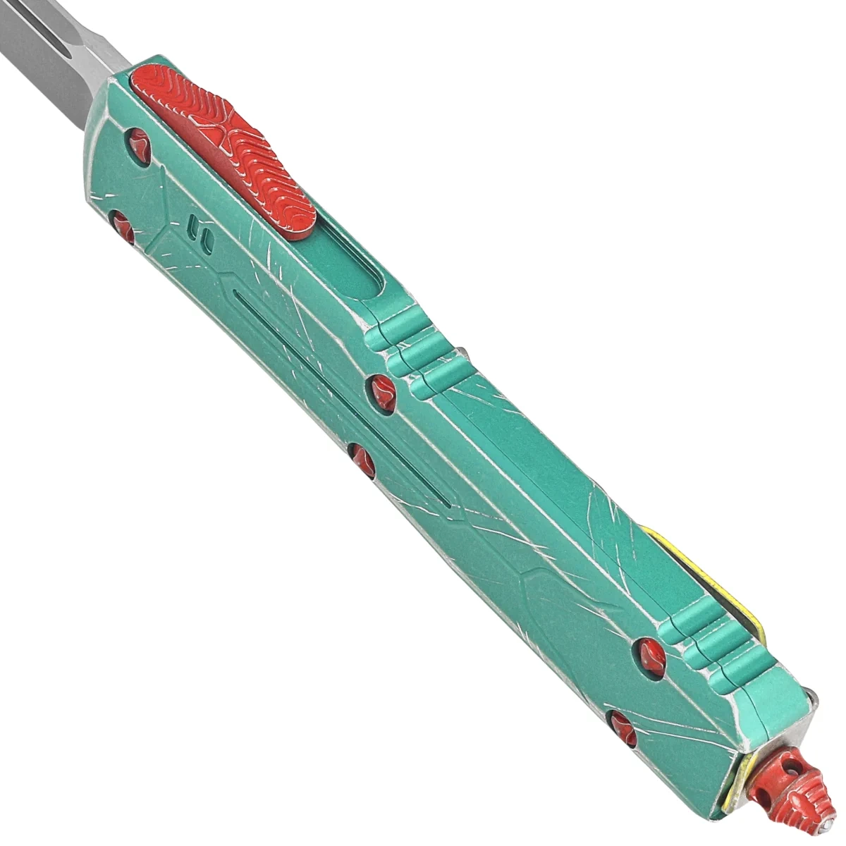 Ultratech S/E Bounty Hunter Distressed Green Aluminum, Apocalyptic is a full-size Ultratech OTF (Out The Front) automatic knife from the Signature Series line. It fully deserves to become part of the Mandalorian Bounty Hunter's equipment. It is colorfully related to the most famous Beskar armor belonging to the legendary Boba Fett. The deeply engraved Mythosaur skull symbol is a symbol of belonging to a clan of proud warriors! Equipped with a hellishly fast mechanism that extends a razor-sharp blade. 100% made and assembled in the USA. Designed by Anthony Marfione, knifemaker and owner of Microtech Knives.