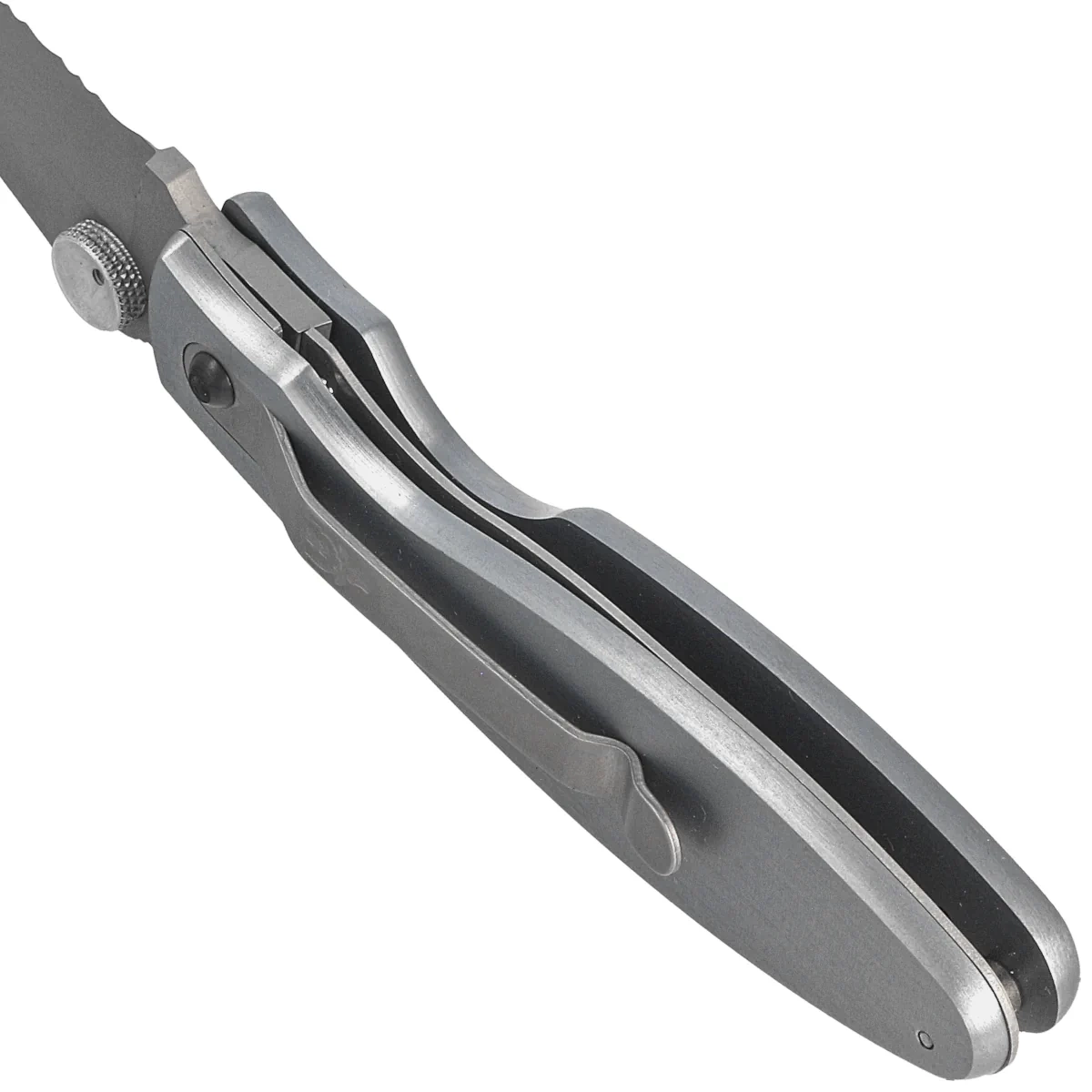 Blade - modern Wharncliffe finished with elegant satin finish, partially serrated. The straight cutting edge converges towards the needle-sharp tip of the knife. The thickness of the blade provides high strength while the flat grind gives excellent cutting edge geometry and extreme cutting performance. It opens with a double-sided pin in the wedge. A section of the back of the wedge creates a thumb ramp for easy control of the knife. The whole is locked with the proven and popular liner lock.