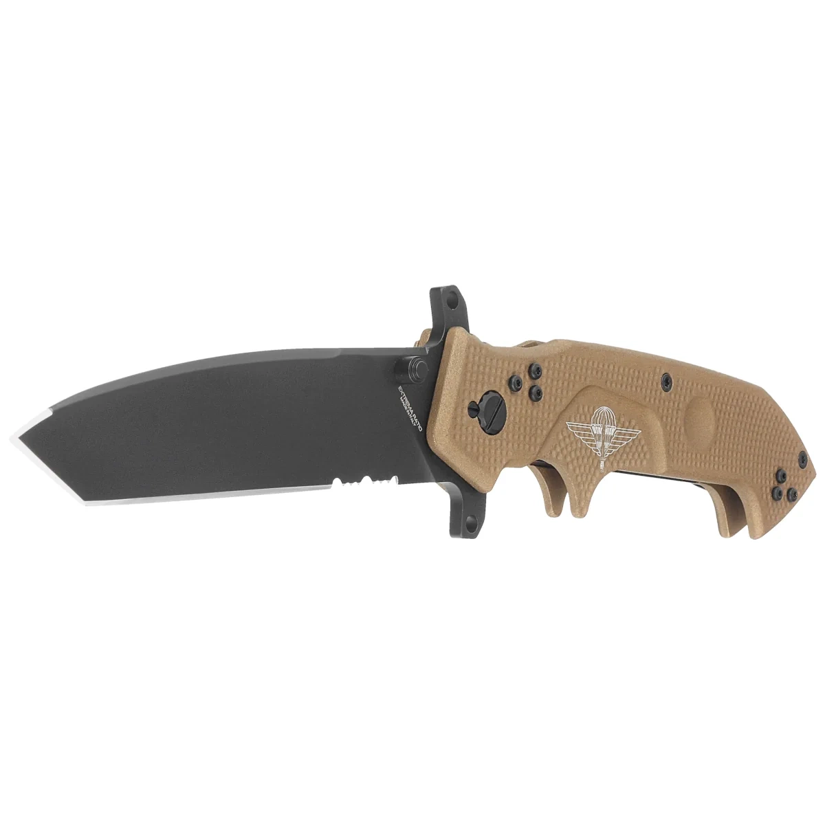Handle - full-length with a length of 5”, similar to assault knives. Anodized aluminum grip grips are finished with a non-slip texture for a secure grip. The so-called open-backed design simplifies cleaning and maintenance. A three-position clip allows you to carry the knife in tip-up / tip-down position with the tip down or up. The folder's head is finished with a peg for beating glass, on the back of the Pommel there is a system for safe cutting of belts or disposable handcuffs.