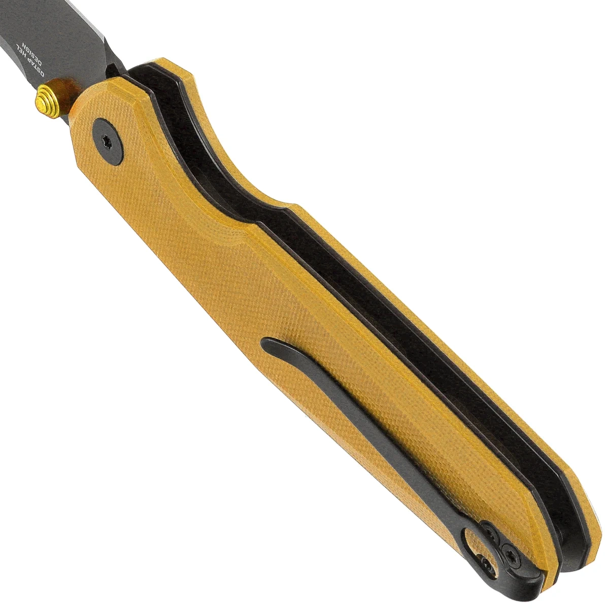 Velix Yellow G10, Black PVD perfect combination of functionality and style, designed by Polish designer and knifemaker Ostap Hel. Made of good materials at an extremely attractive price, the folder features a Sandvik 14C28N stainless steel blade, a reversible clip and a gravity-opening blade, Button Lock. This exceptional knife will meet your requirements, whether you are outdoors or performing everyday tasks. Bestseller!