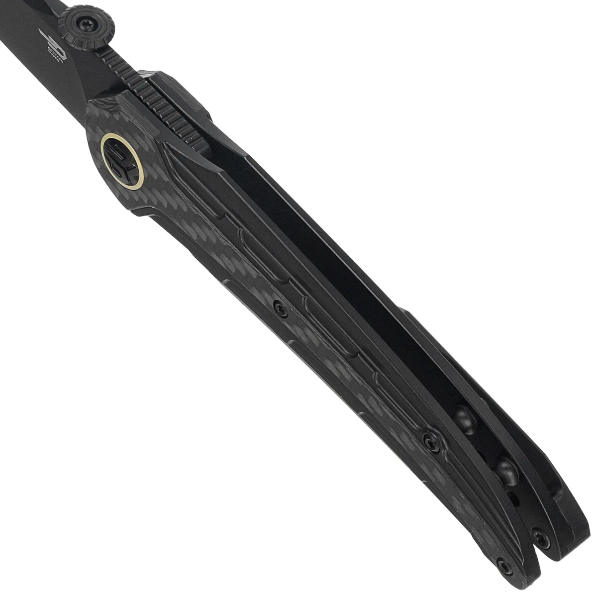 Prydwen Black Titanium/Carbon Fiber, Black PVD large and sturdy EDC folder aimed at discerning consumers, the result of cooperation between Polish designer Grzegorz “Kombou” Grabarski and Bestech Knives. Artful titanium Handle with striking Fat Carbon inserts, excellent CPM MagnaCut blade steel! Inspired by the shape of the airship “Prydwen” from the popular game Fallout!