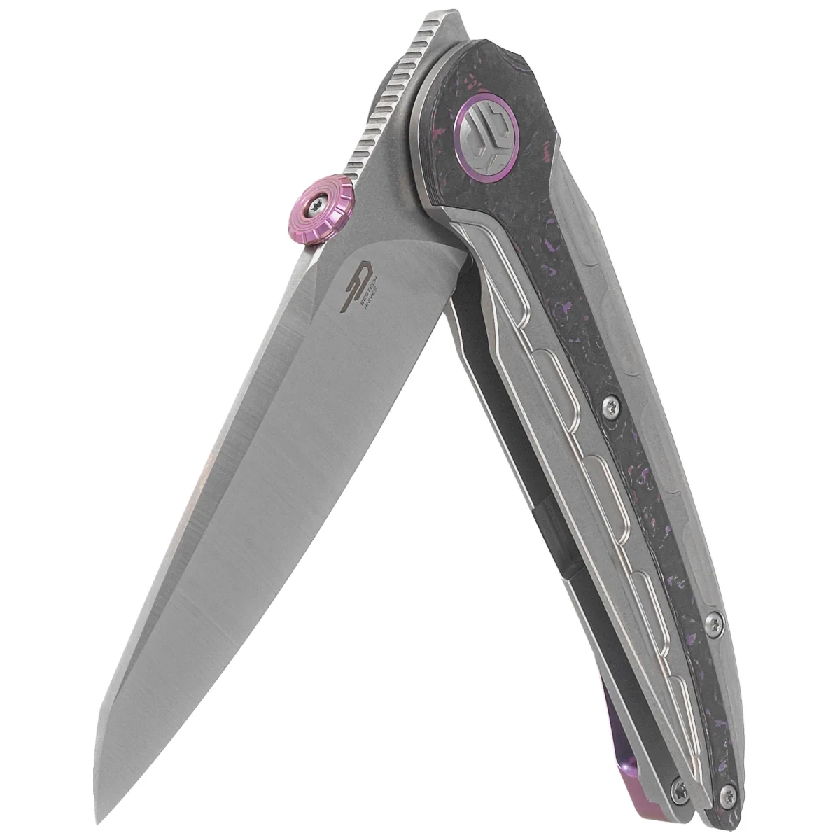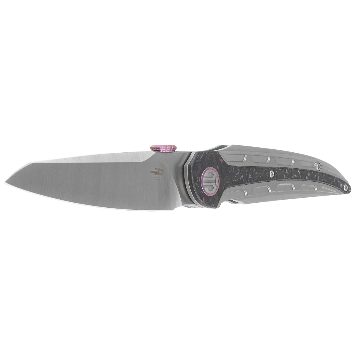 Prydwen Grey Titanium/Purple Haze Fat Carbon, Stonewashed/Satin large andsturdy EDC folder aimed at discerning buyers, the result of cooperation between Polish designer Grzegorz “Kombou” Grabarski and Bestech Knives. Artful titanium Handle with striking Fat Carbon inserts, excellent CPM MagnaCut blade steel! Inspired by the shape of the airship “Prydwen” from the popular game Fallout!