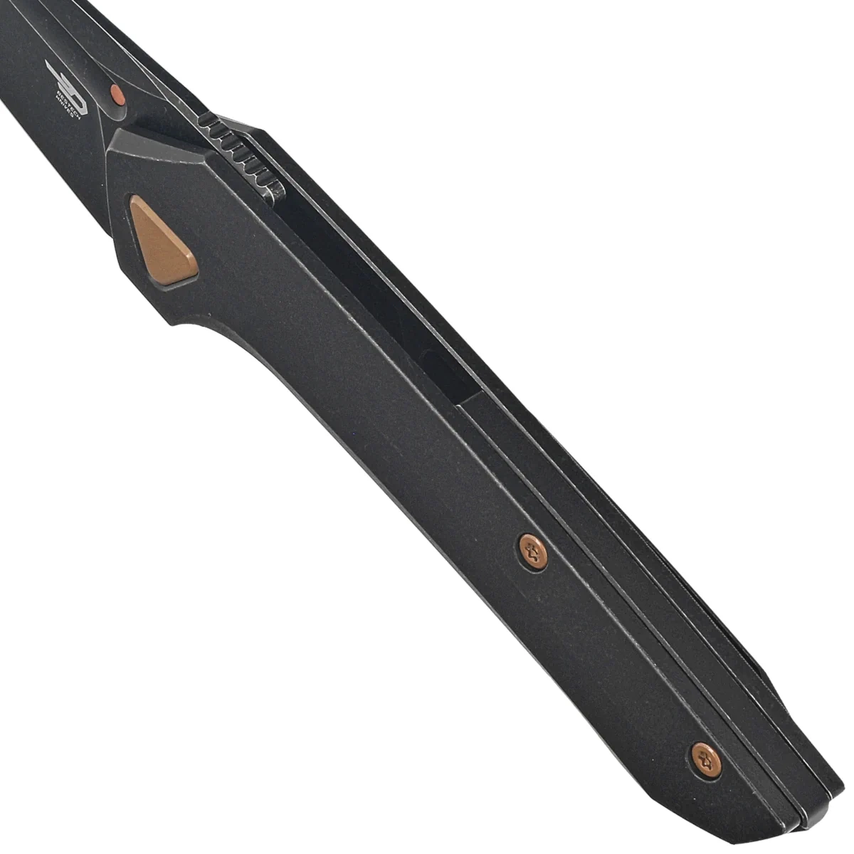 Handle - solid titanium 6AL4V in black and bronze colors, joined together by a solid titanium backspacer. The simplicity and solidity of the design give the assurance of many years of use. The pivot axis has been placed inside a triangular steel inlay. Single-position clip (right), made of titanium, allows you to carry the knife in tip-up position.