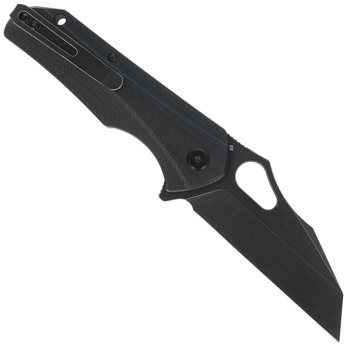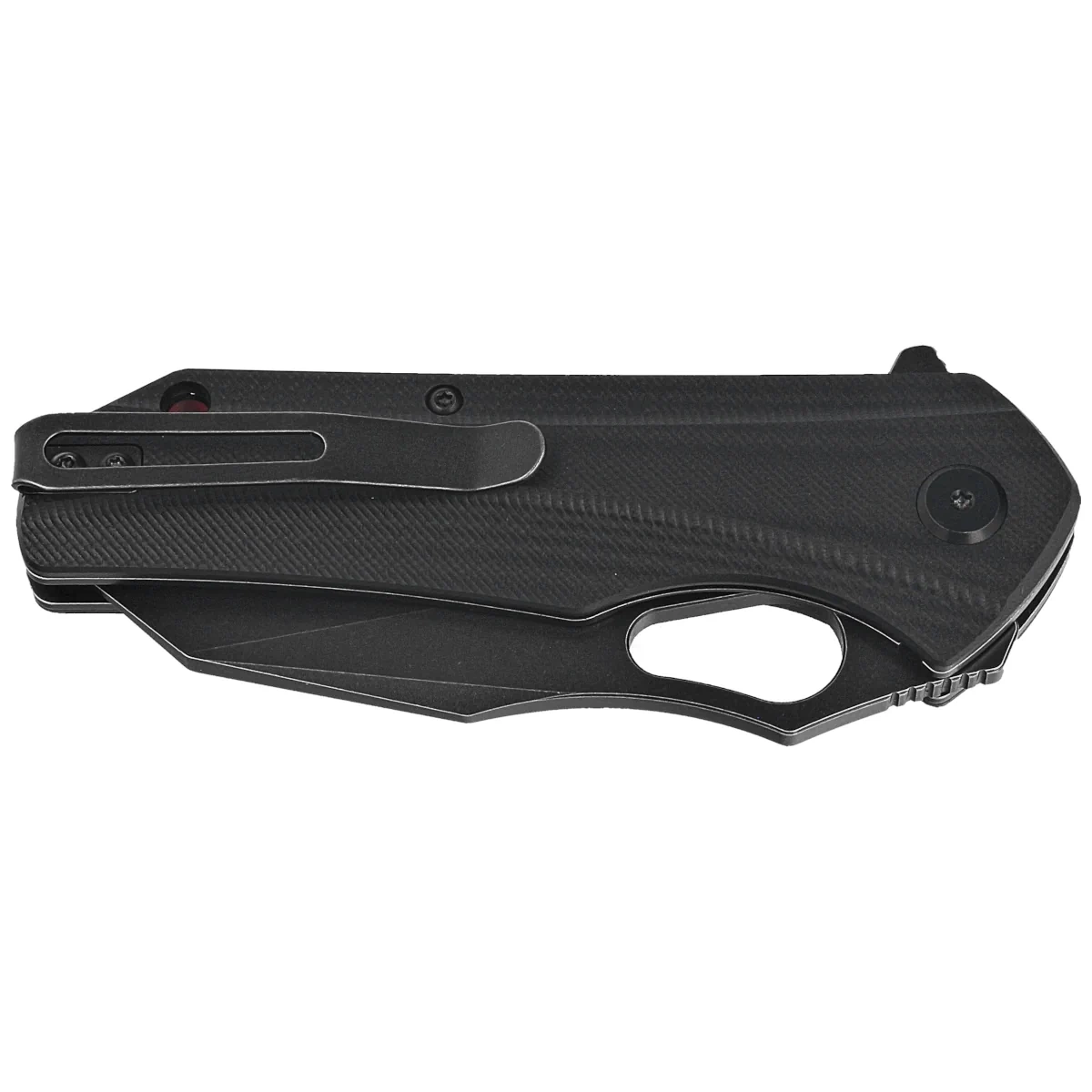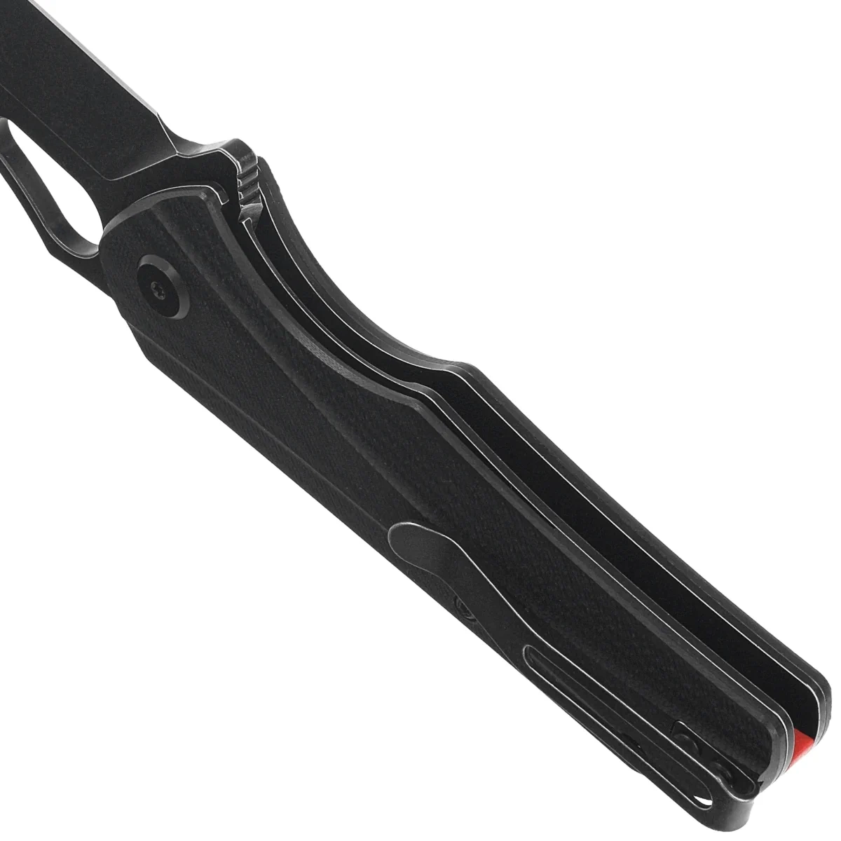 Handle - grips made of G10 composite, practically indestructible plastic insensitive to weather conditions, resistant to chemicals and mechanical damage. Chamfered edges of the covers eliminate sharp edges and texturing of the surface improves grip security. The backspacer to which the grips are attached guarantees the rigidity and strength of the entire structure. The fore finger groove improves grip confidence. The single-position, right-side deep carry clip allows the knife to be carried in tip-up position, with the tip of the blade upward. Above the clip, a hole for a safety or decorative cord.