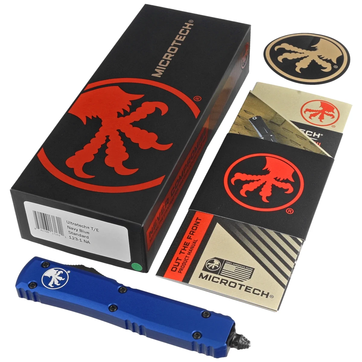 Ultratech T/E Navy Blue Aluminum, Satin is a full-size OTF (Out The Front) automatic knife from the Ultratech series. Featuring a hellishly fast extension mechanism with a razor-sharp tanto edge blade in a utilitarian Stonewashed finish. Handle made of Mil-Spec hard-coated aluminum. 100% made and assembled in the USA. Designed by Anthony Marfione, knifemaker and owner of Microtech Knives.