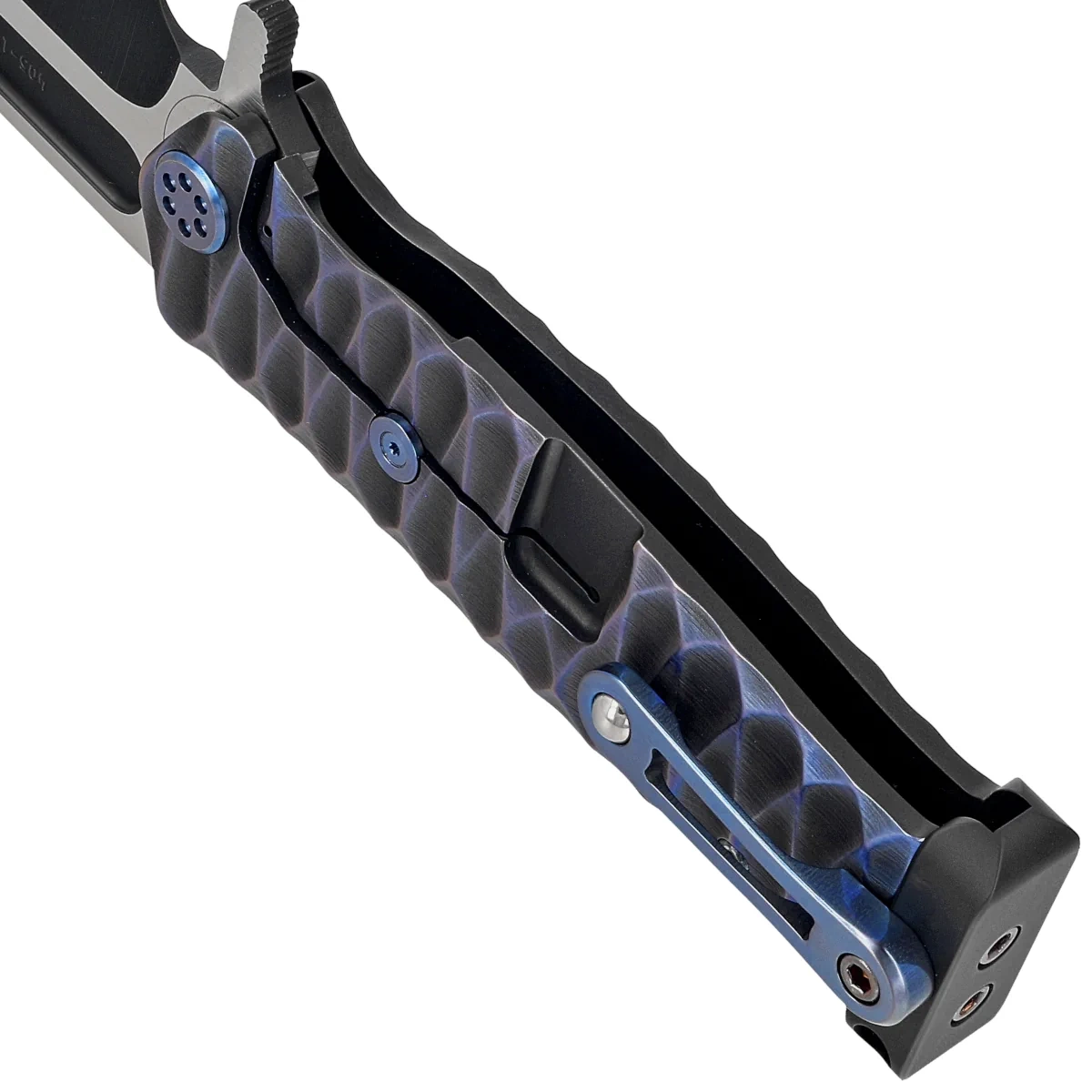 Handle - made of solid titanium was covered with sculpting ''Diamond Head''. The massive Pommel at the back of the Handle is responsible for balance and balance and can also be used as an improvised hammer or glass breaker. The whole is complemented by a unique in form clip, of course, also made of titanium. The screws, like the clip, are flame dyed.