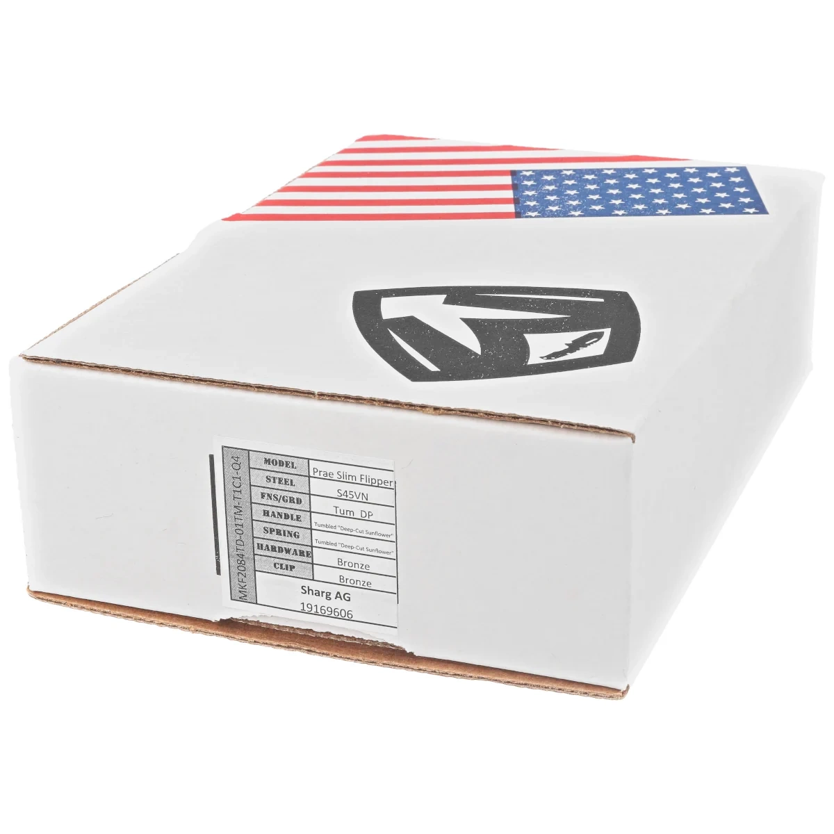 • Praetorian Slim DP "Deep-Cut Sunflower" Titanium, Bronze HW/Clip, Tumbled slimmer version of MKT's flagship Praetorian T knife, featuring a hand-crafted hollow grind. In the knife industry, achieved by only a select manufacturers.