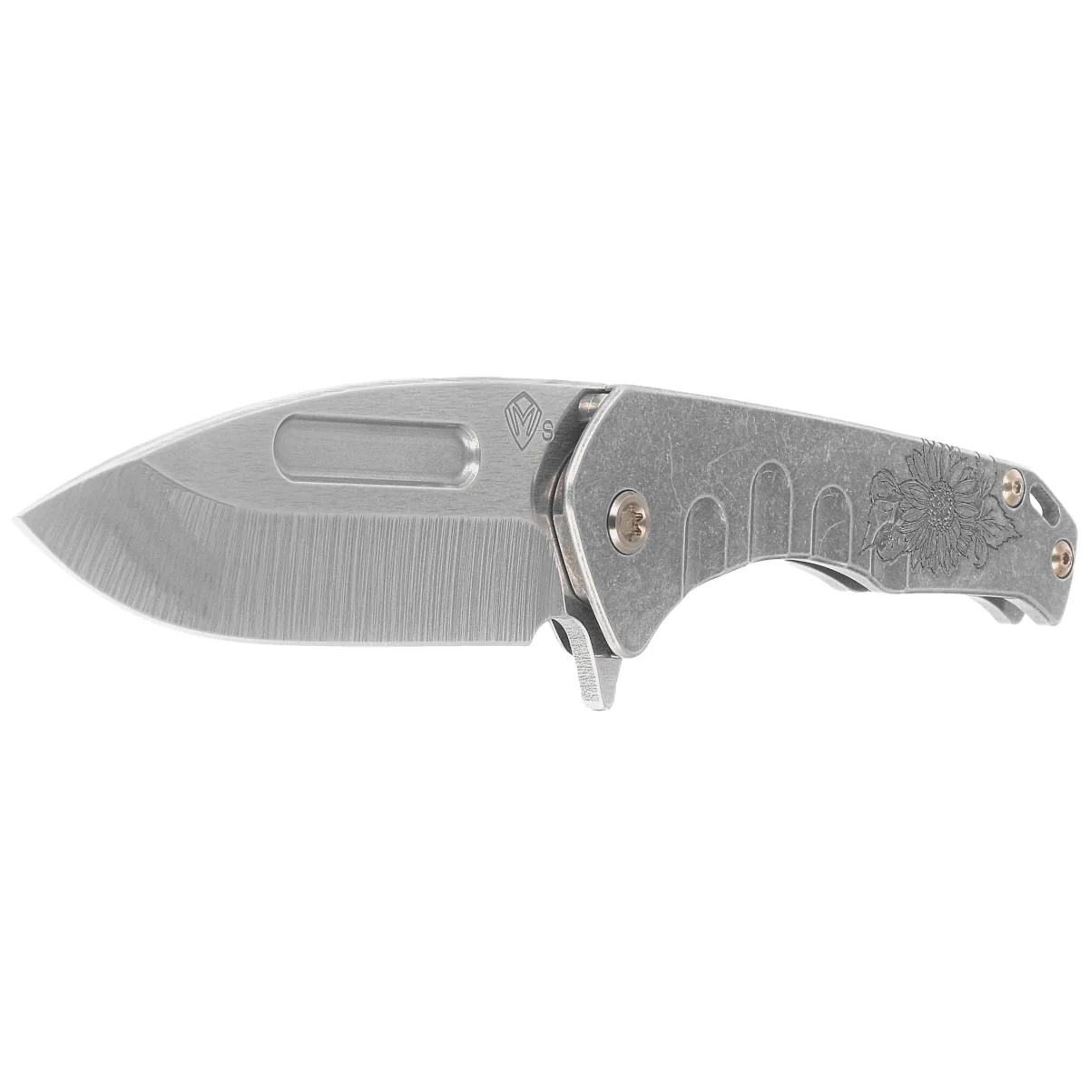 Handle - made of solid titanium, tumbled machine finish and decorated with a deep engraving depicting a sunflower flower. The whole is complemented by a massive clip, of course, also made of titanium, anodized in bronze color. The screws are also stained bronze.