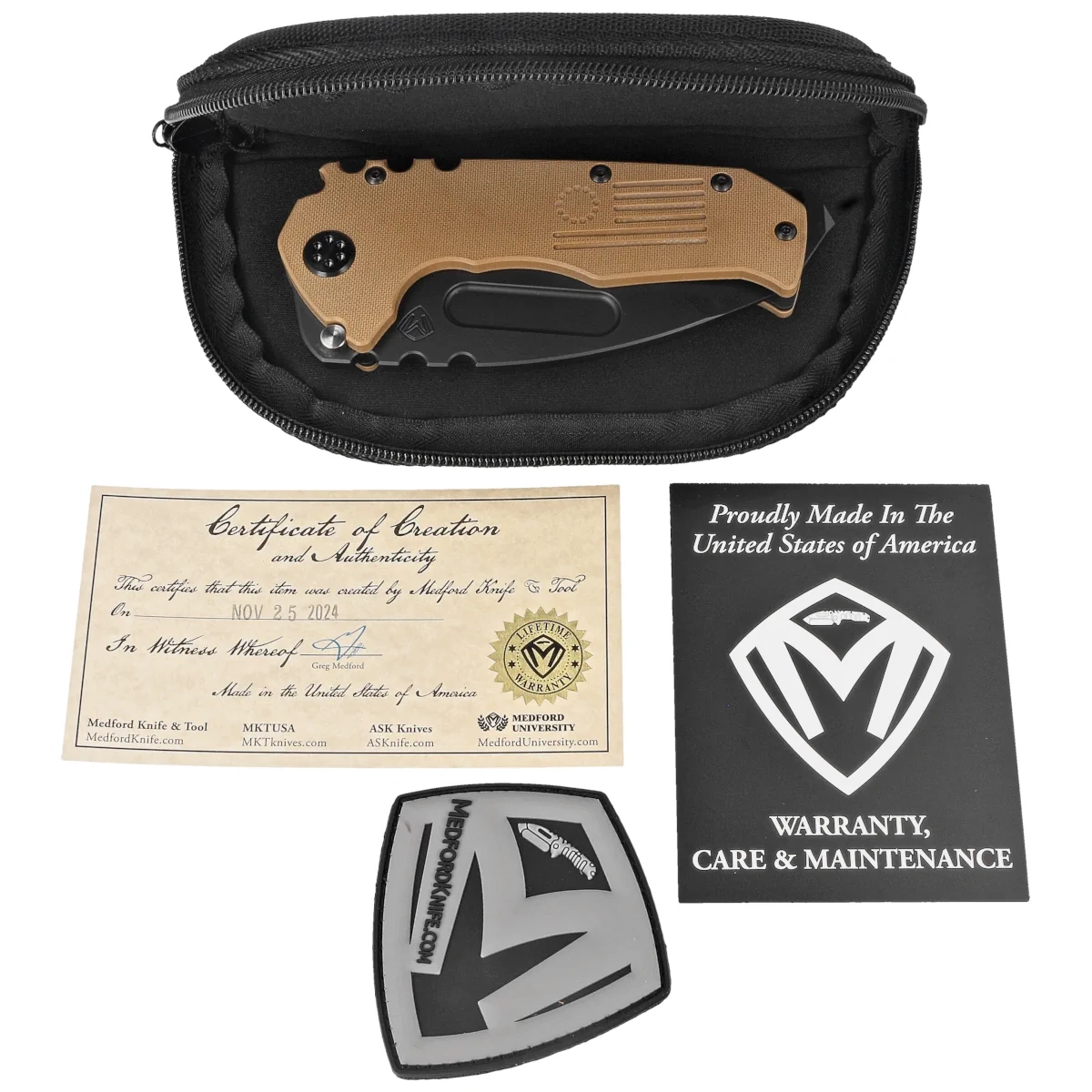 Included - cardboard box, nylon pouch, company patch with Velcro attachment and signed “Certificate of Creation and Authenticity”.